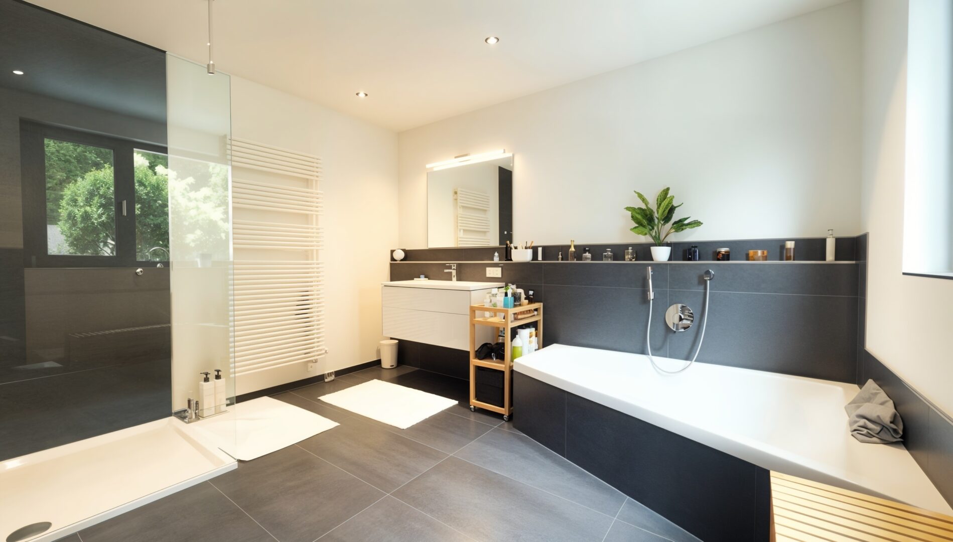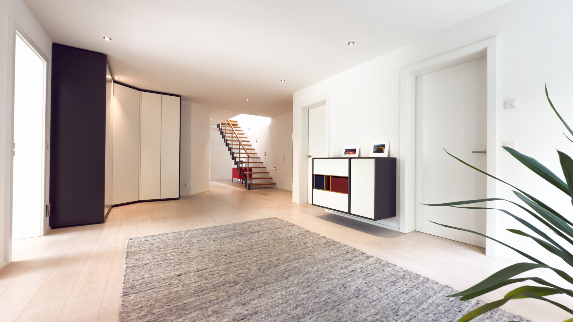 Die privaten Wohnräume befinden sich im unteren Geschoss: vier großzügige Schlafzimmer, zwei stilvolle Badezimmer und ein Hauswirtschaftsraum. Hier schlägt das Versorgungsherz des Hauses – eine hochmoderne Luft-Wärmepumpe in Verbindung mit einer Lüftungsanlage samt Wärmerückgewinnung versorgt die im gesamten Haus verlegte Fußbodenheizung und sorgt für ein behagliches Klima, ganz gleich zu welcher Jahreszeit.
