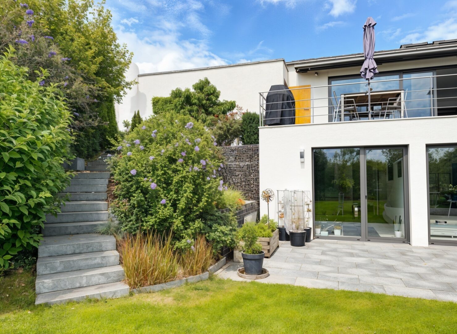 Eine elegante Treppe geleitet Sie hinunter in den weitläufigen Garten. Hier, auf rund 700 m² unbebauter Fläche, lässt sich Ihre Vision vom perfekten Outdoor-Leben verwirklichen – ob exklusiver Pool, edle Außensauna oder einfach ein Rückzugsort im Grünen.