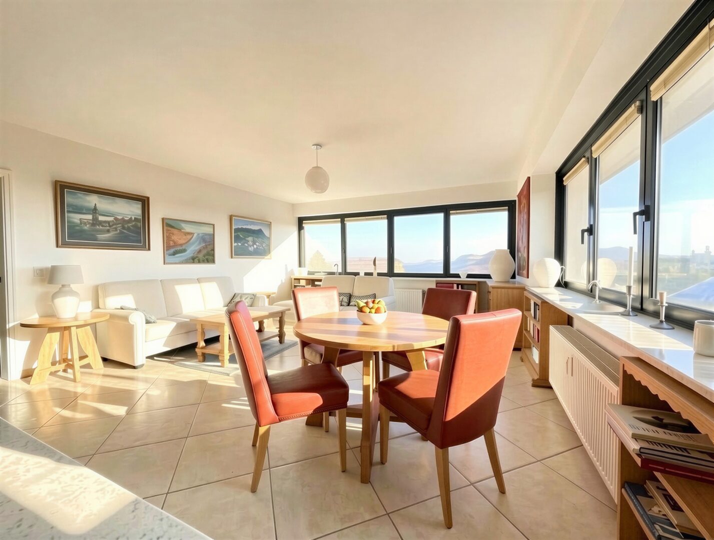 Das geräumige, mit Mosaikfliesen geschmückte Entrée eröffnet den Zugang zum großzügigen, offenen Wohn- und Essbereich. Dort erwartet Sie ein lichtdurchflutetes Ambiente mit umlaufenden Fenstern, die Ihnen einen wundervollen, unverbaubaren Panoramablick über die Dächer des Hamburger Zentrums bis zur Elbphilharmonie bieten.