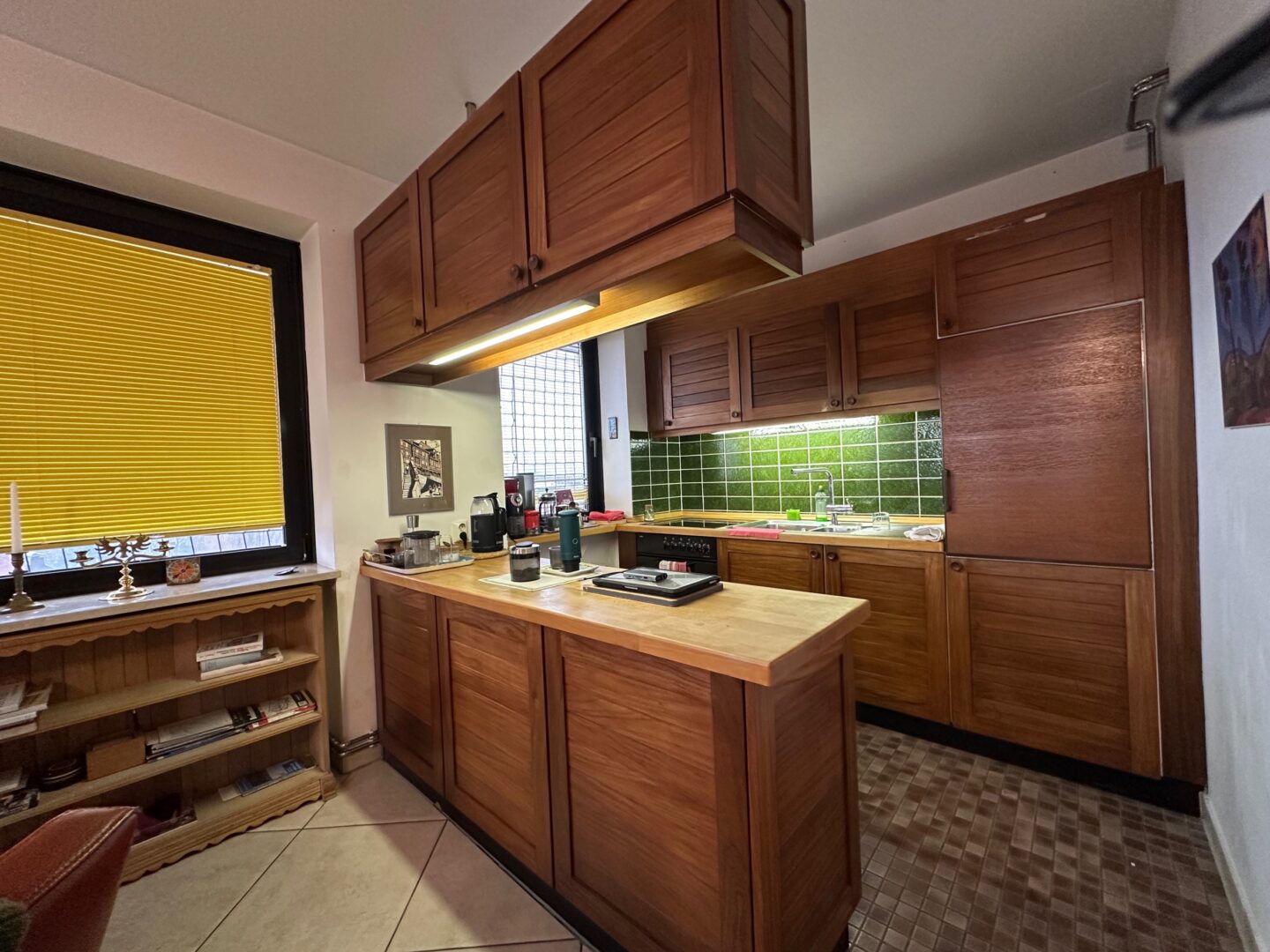 Die Einbauküche ist mit einer offenen Verbindung gestaltet und verfügt ebenfalls über ein Fenster nach Südwesten. Die Küchenmöbel und Fliesen im Originalstil der 70er Jahre verleihen der Wohnung einen besonderen Charme. Hier haben Sie natürlich auch die Möglichkeit, Ihre eigenen Vorstellungen des kulinarischen Mittelpunkts zu verwirklichen.