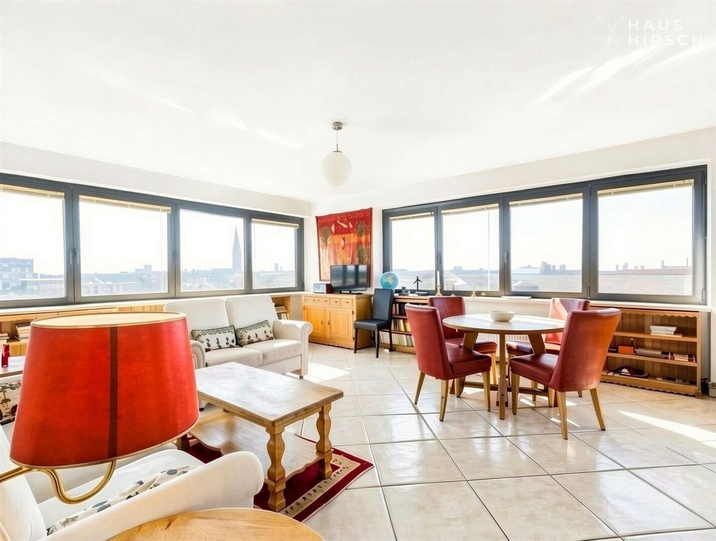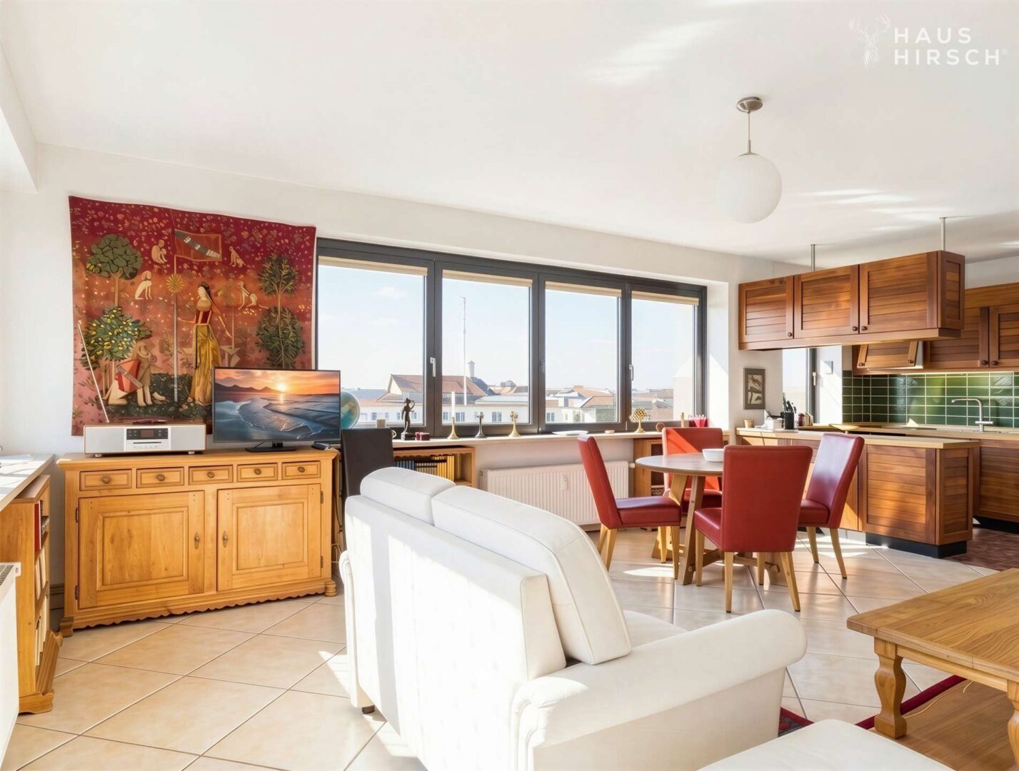Das geräumige, mit Mosaikfliesen geschmückte Entrée eröffnet den Zugang zum großzügigen, offenen Wohn- und Essbereich. Dort erwartet Sie ein lichtdurchflutetes Ambiente mit umlaufenden Fenstern, die Ihnen einen wundervollen, unverbaubaren Panoramablick über die Dächer des Hamburger Zentrums bis zur Elbphilharmonie bieten.