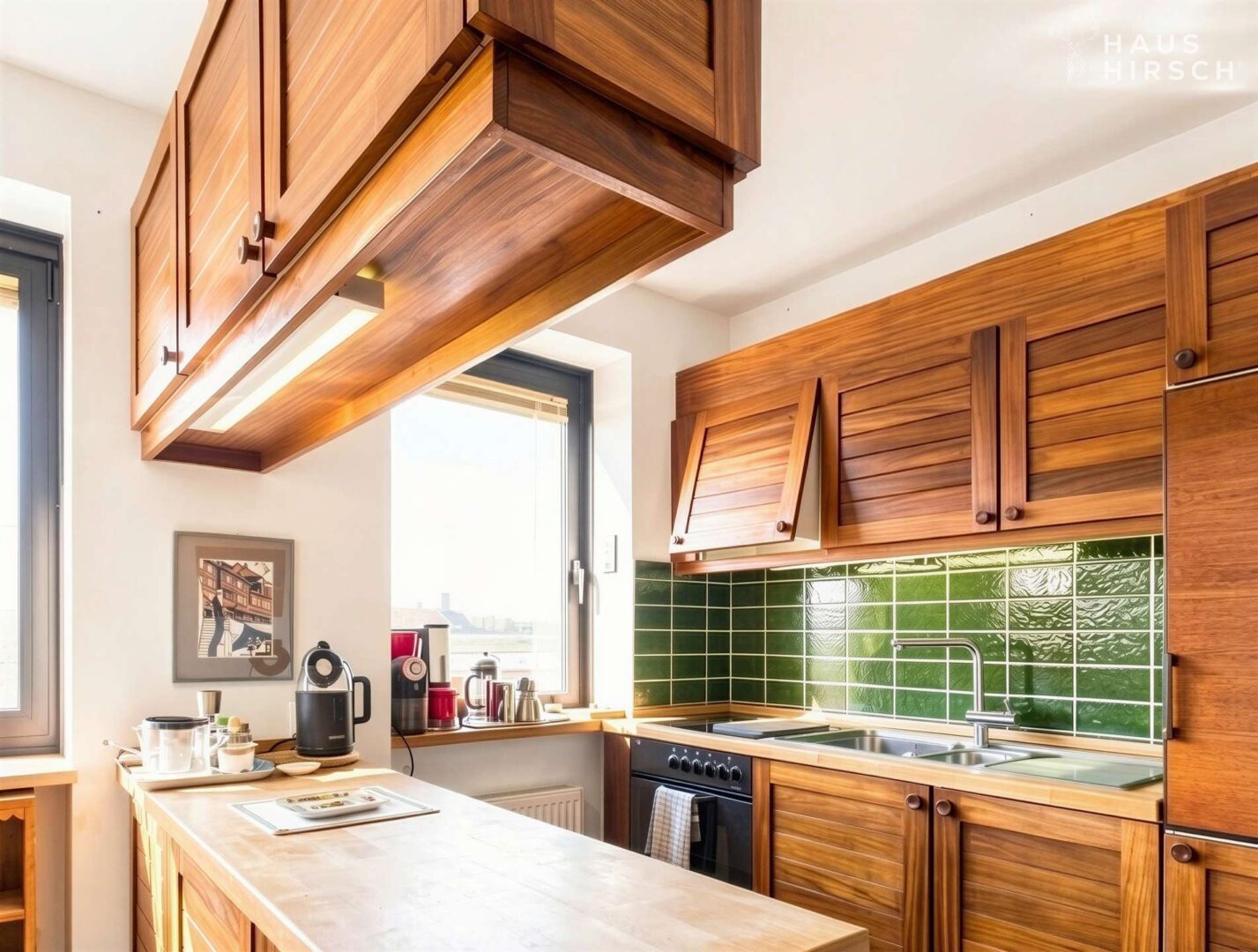 Die Einbauküche ist mit einer offenen Verbindung gestaltet und verfügt ebenfalls über ein Fenster nach Südwesten. Die Küchenmöbel und Fliesen im Originalstil der 70er Jahre verleihen der Wohnung einen besonderen Charme. Hier haben Sie natürlich auch die Möglichkeit, Ihre eigenen Vorstellungen des kulinarischen Mittelpunkts zu verwirklichen.