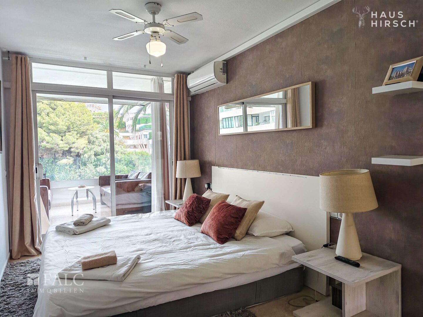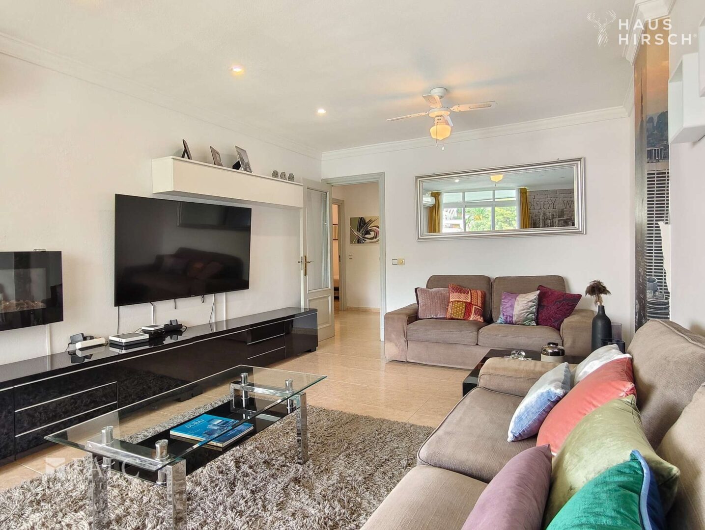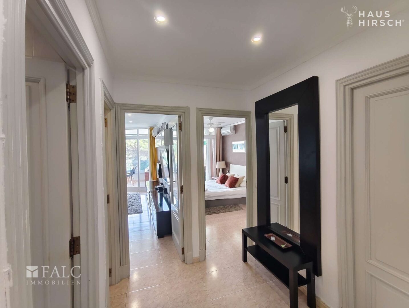 Beim Betreten des Apartments empfängt Sie ein einladender Eingangsbereich, der in den großzügigen Wohn- und Essbereich führt. Von hier aus gelangen Sie auf die sonnige Terrasse, die genügend Platz zum Entspannen und für gesellige Abende im Freien bietet. Zwei helle Schlafzimmer – eines davon mit direktem Terrassenzugang – sowie zwei moderne, hochwertig ausgestattete Badezimmer sorgen für Komfort. Eine separate, voll ausgestattete Küche rundet das Raumangebot ab.