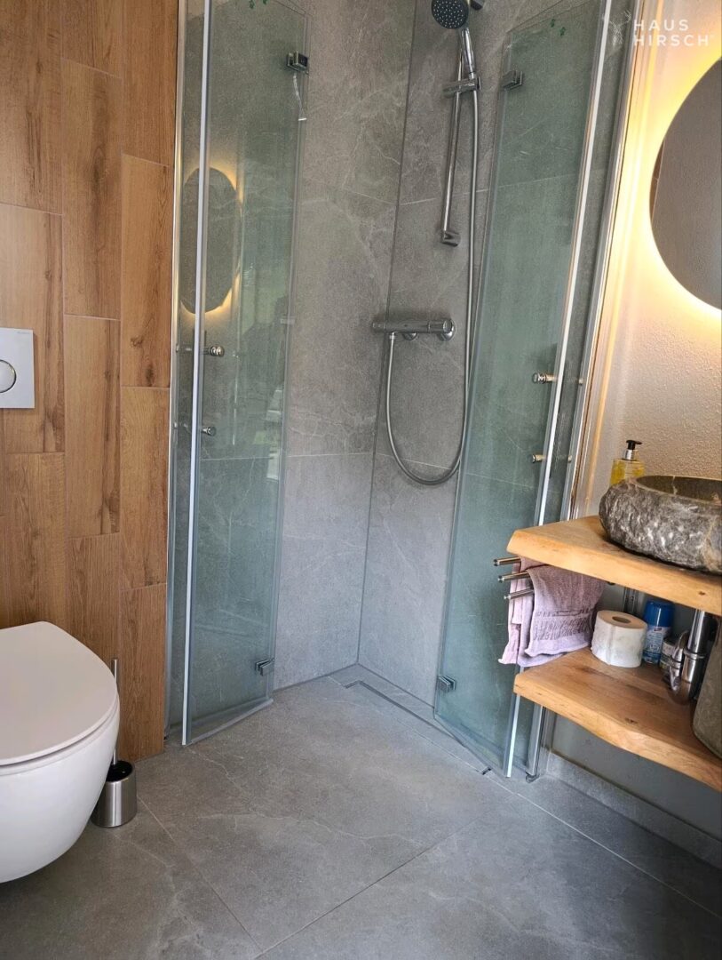 Die abgetrennte Wohneinheit im Erdgeschoss eignet sich ideal für pflegebedürftige Eltern, mit einem stufenlosen Zugang, einer bodenebenen Dusche und einem separaten Eingang, um Privatsphäre zu gewährleisten.
