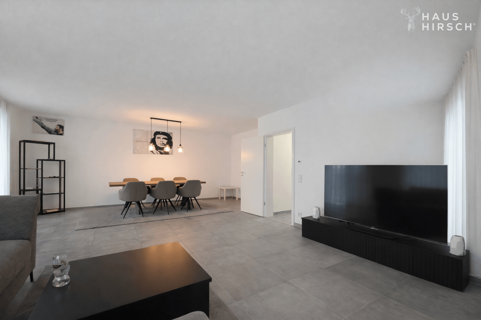 Der offen gestaltete Wohn- und Essbereich im Erdgeschoss bildet das Herzstück des Hauses. Große Fensterflächen sorgen für ein helles, freundliches Ambiente und führen direkt auf die Terrasse und in den Garten. Ein besonderes Highlight ist die luxuriöse Einbauküche, die erst wenige Monate alt ist und höchsten Design- und Qualitätsansprüchen gerecht wird – ideal für Familien und anspruchsvolle Hobbyköche.