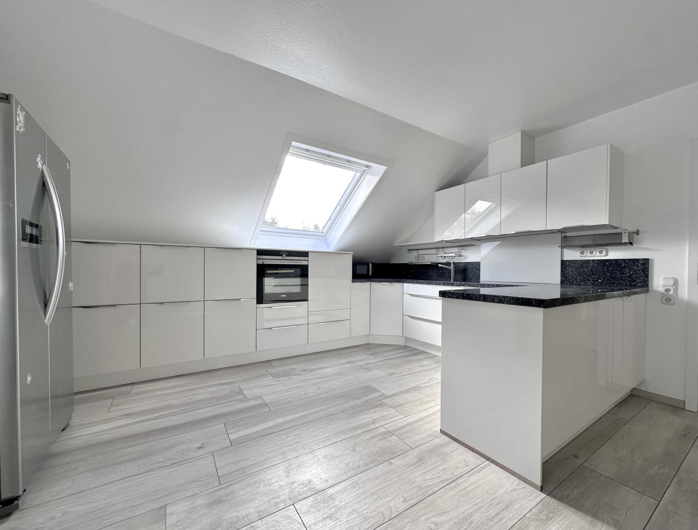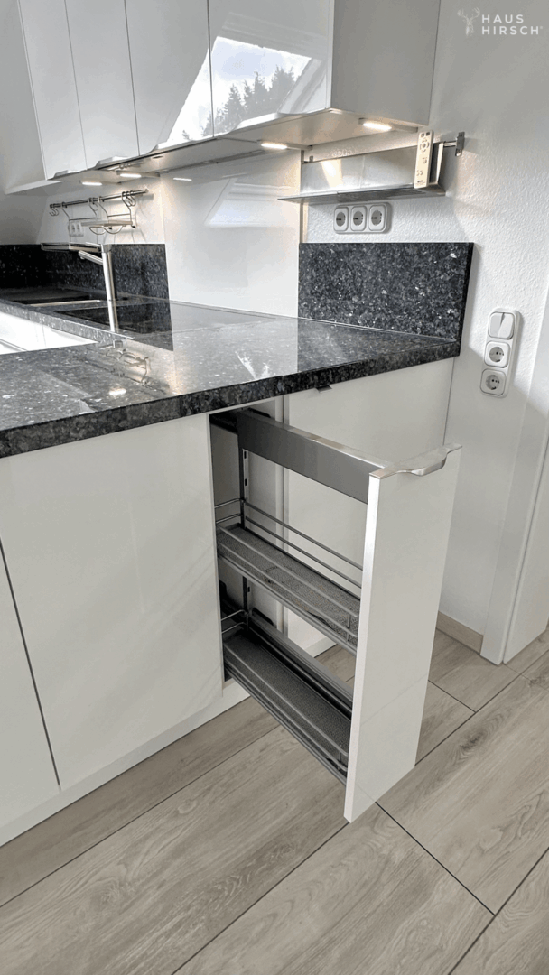 Die maßgefertigte, sehr neuwertige Design-Einbauküche mit hochglänzenden Fronten, schwarzen Granit-Arbeitsflächen und modernster Geräteausstattung, sowie XL Kühlschrank lässt keine Wünsche offen. Hier trifft Funktionalität auf Ästhetik – ein Raum, der Kochen zum Erlebnis macht. Diese wird mit vermietet.