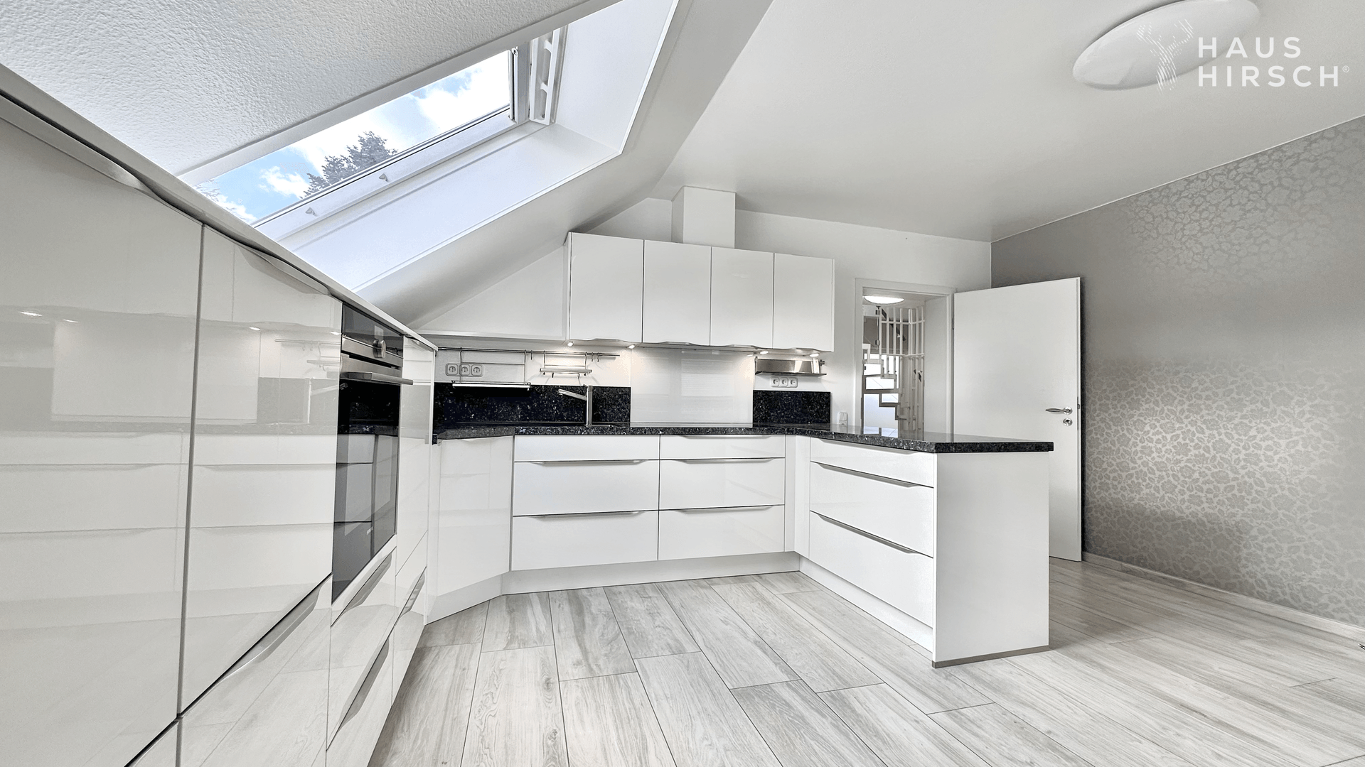Ein echtes Highlight ist die maßgefertigte Designküche mit hochglänzenden Fronten und einer edlen Granit-Arbeitsplatte. Hochwertige Einbaugeräte, eine elegante Rückwand aus Stein und eine harmonische Beleuchtung machen diesen Raum zu einem Ort, an dem Funktionalität und Stil perfekt verschmelzen.