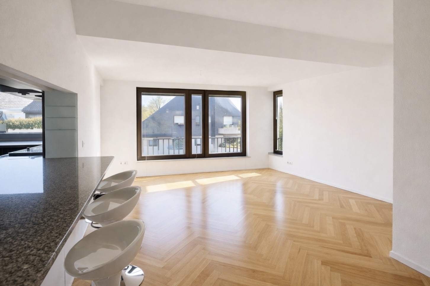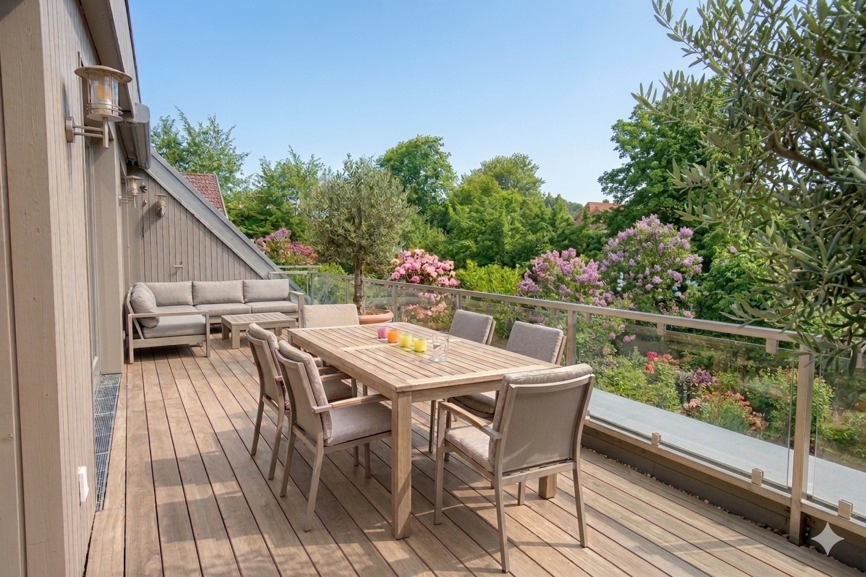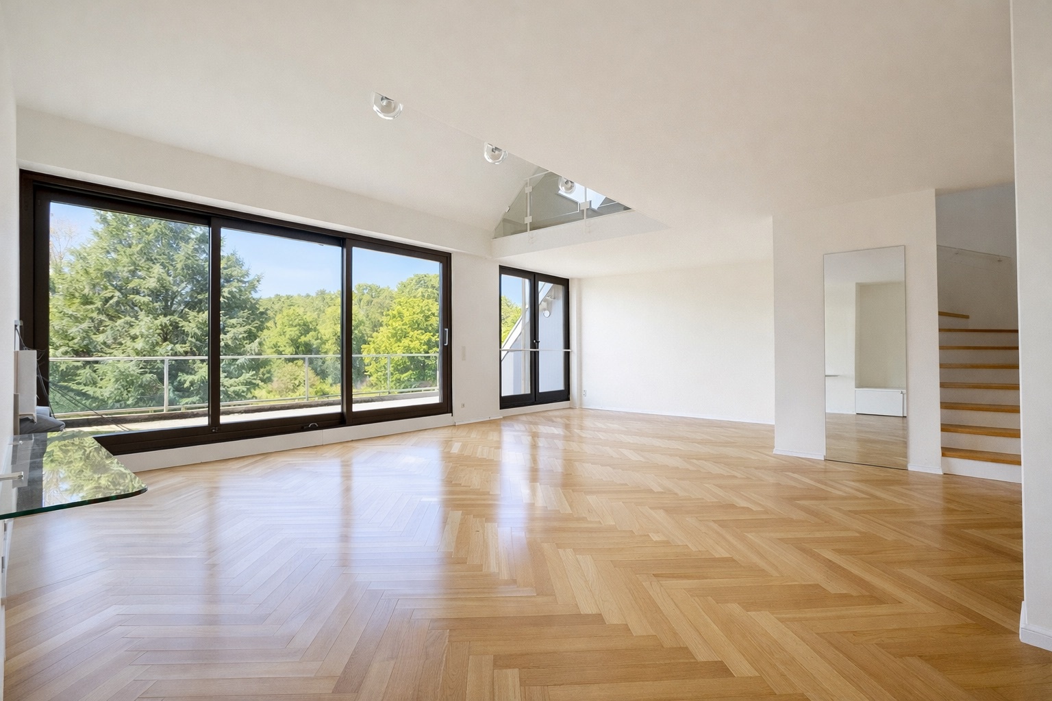 Die großzügige Sonnenterrasse in Süd-West-Ausrichtung lädt zu entspannten Stunden mit Blick ins Grüne ein und unterstreicht den besonderen Charakter dieser Immobilie. Hochwertige Materialien wie Fischgrät-Echtholzparkett und eine gehobene Ausstattung
