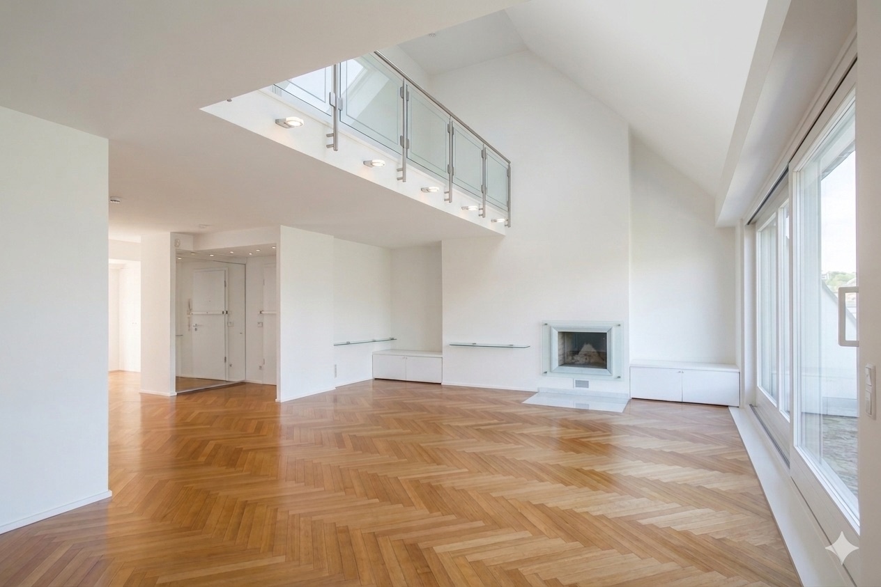 Der lichtdurchflutete Wohn- und Essbereich mit Kamin bildet das Herzstück der Wohnung und verbindet stilvolles Wohnen mit behaglicher Atmosphäre. Große Fensterfronten und der offene Luftraum zur Galerie schaffen ein außergewöhnliches Raumgefühl und lassen Innen- und Außenbereich harmonisch verschmelzen.