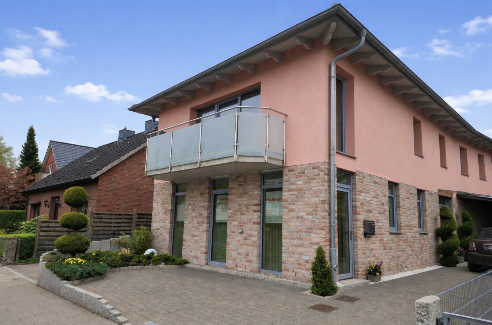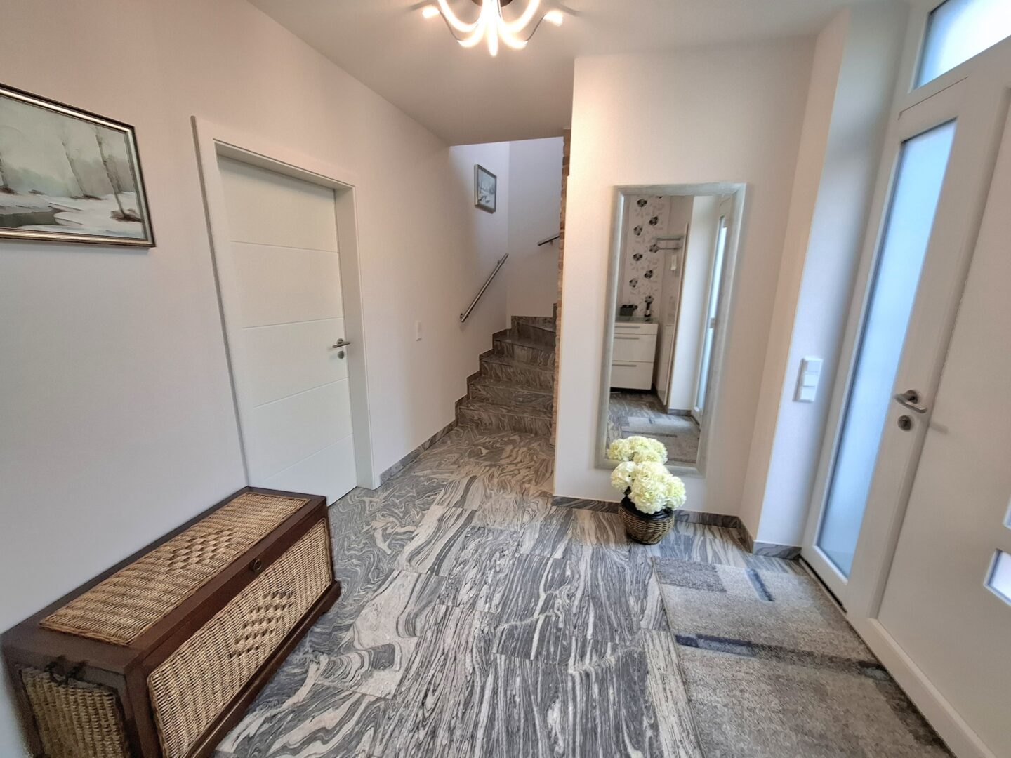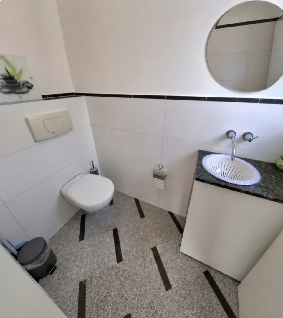 Ein markanter, repräsentativer Vorteil dieser Immobilie ist die separate Gewerbe- bzw. Wohneinheit im vorderen Bereich des Hauses. Ausgestattet mit einem eigenen Eingang und einem Gäste-WC, bietet dieser Bereich optimale Bedingungen für eine Praxis, ein Büro oder eine Einliegerwohnung, ohne die Privatsphäre des Hauptwohnbereichs zu tangieren.