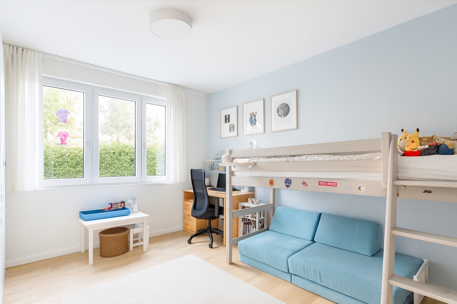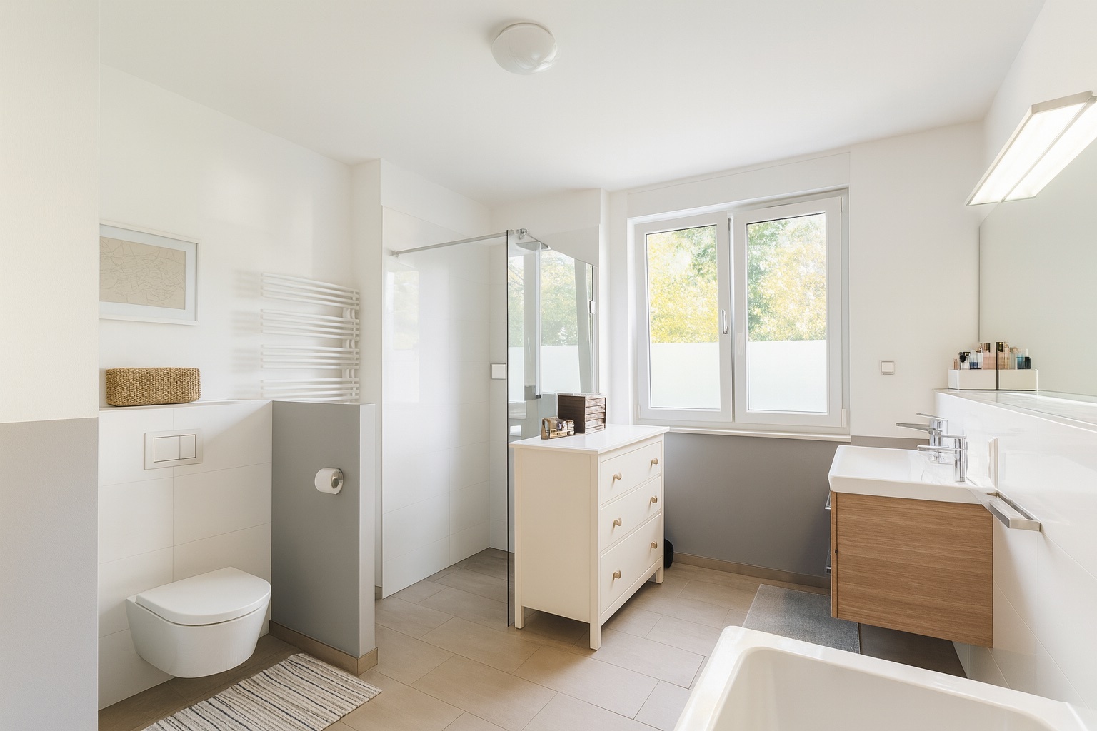 Drei Schlafzimmer bieten Rückzug und Privatsphäre, ergänzt von zwei stilvollen Tageslicht-Bädern – beide mit bodengleicher Dusche, eines zusätzlich mit Badewanne.
