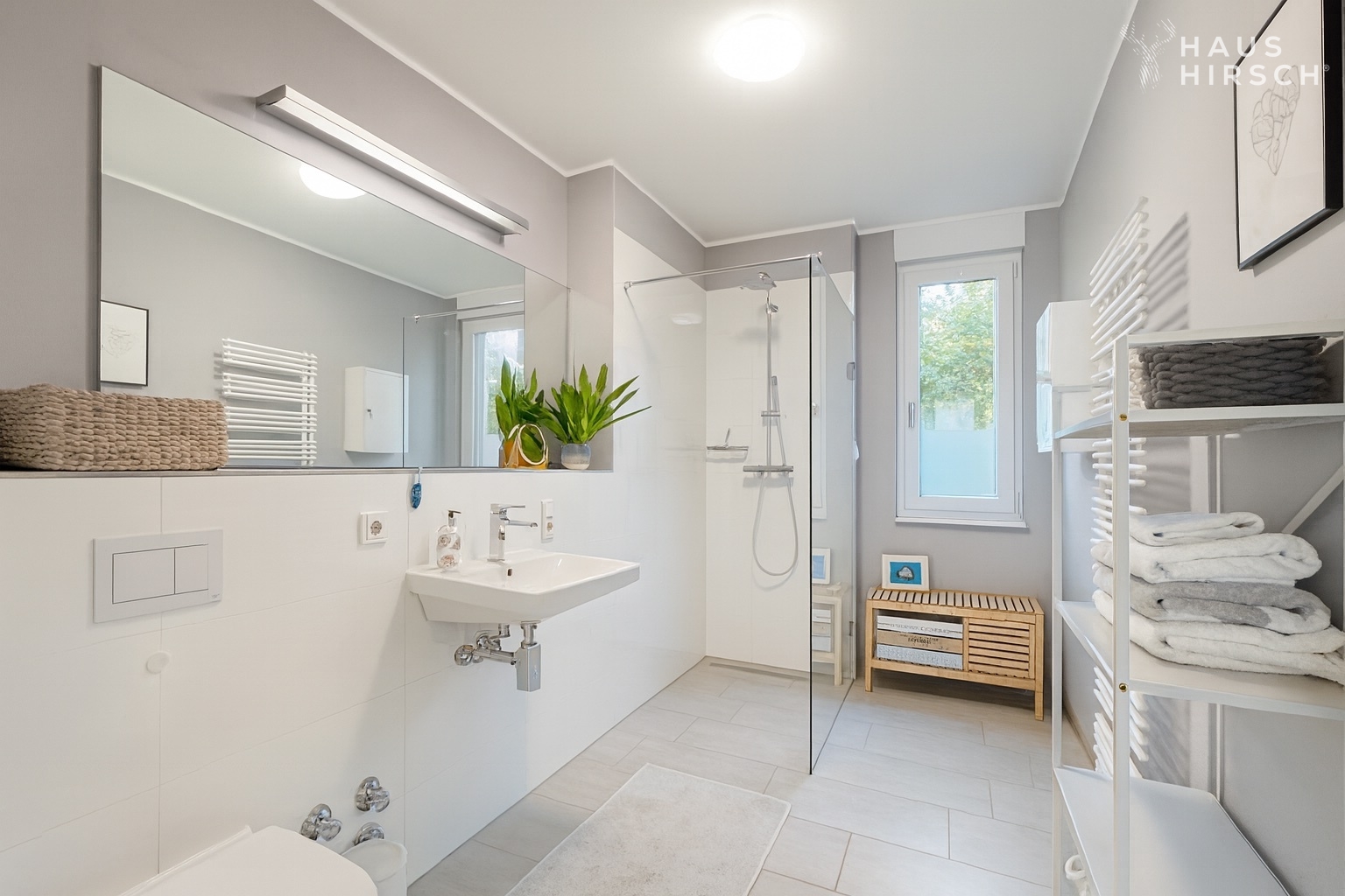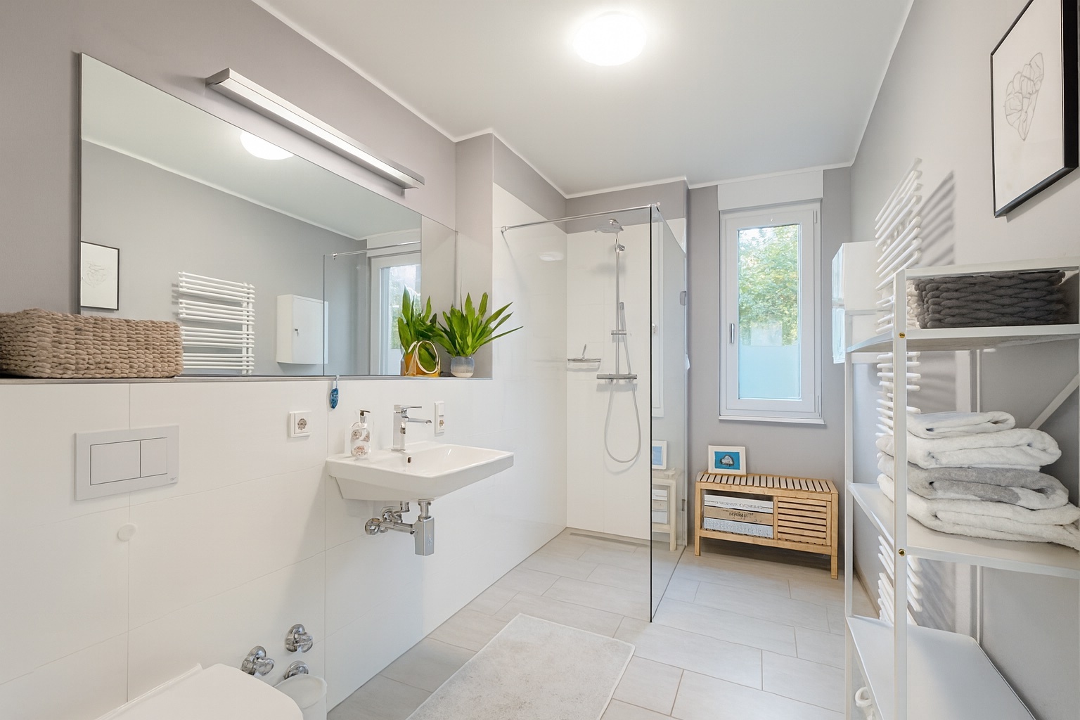 - Großformatige Feinsteinfliesen in Bädern und Küche