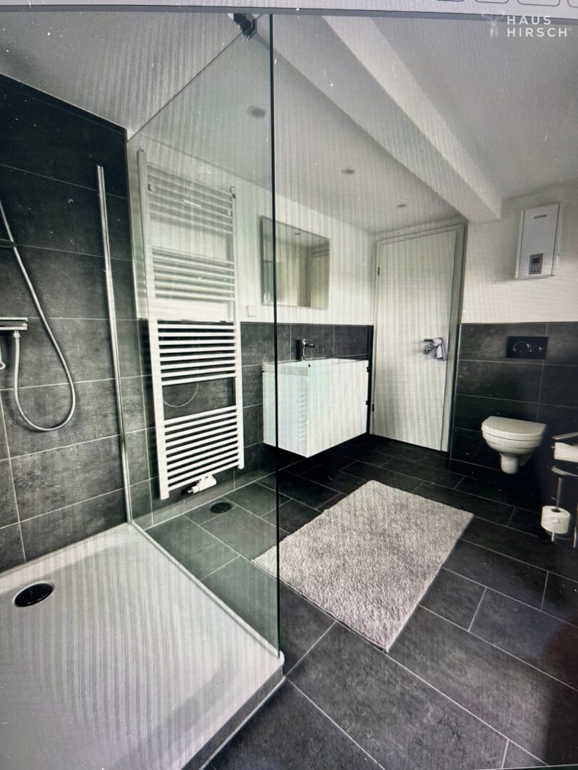 Das moderne Badezimmer mit einem weiteren Balkon lädt zum Entspannen ein und bietet eine Wohlfühloase nach einem langen Tag.