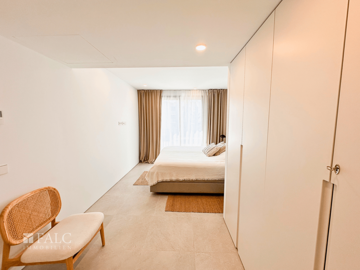 Zwei komfortable Schlafzimmer, darunter eine Master-Suite mit eigenem Bad, sowie ein weiteres edel ausgestattetes Badezimmer sorgen für höchsten Wohnkomfort. Die Wohnung wird komplett möbliert angeboten – sofort bezugsfertig und perfekt aufeinander abgestimmt.