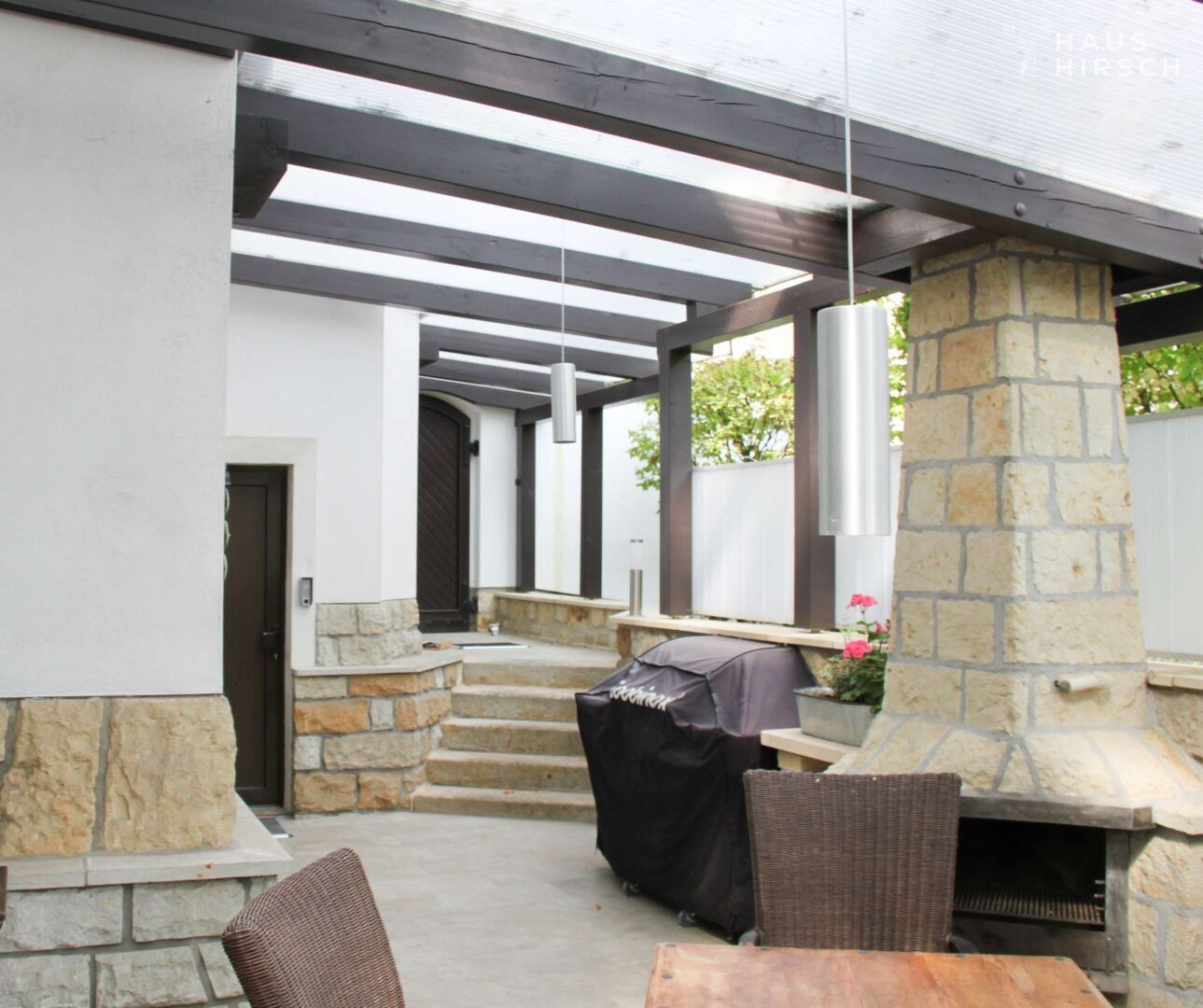 Der Außenbereich bietet Raum für Erholung und Privatsphäre, während ein Carport mit Platz für bis zu vier Fahrzeugen den hohen Anspruch an Komfort abrundet.
