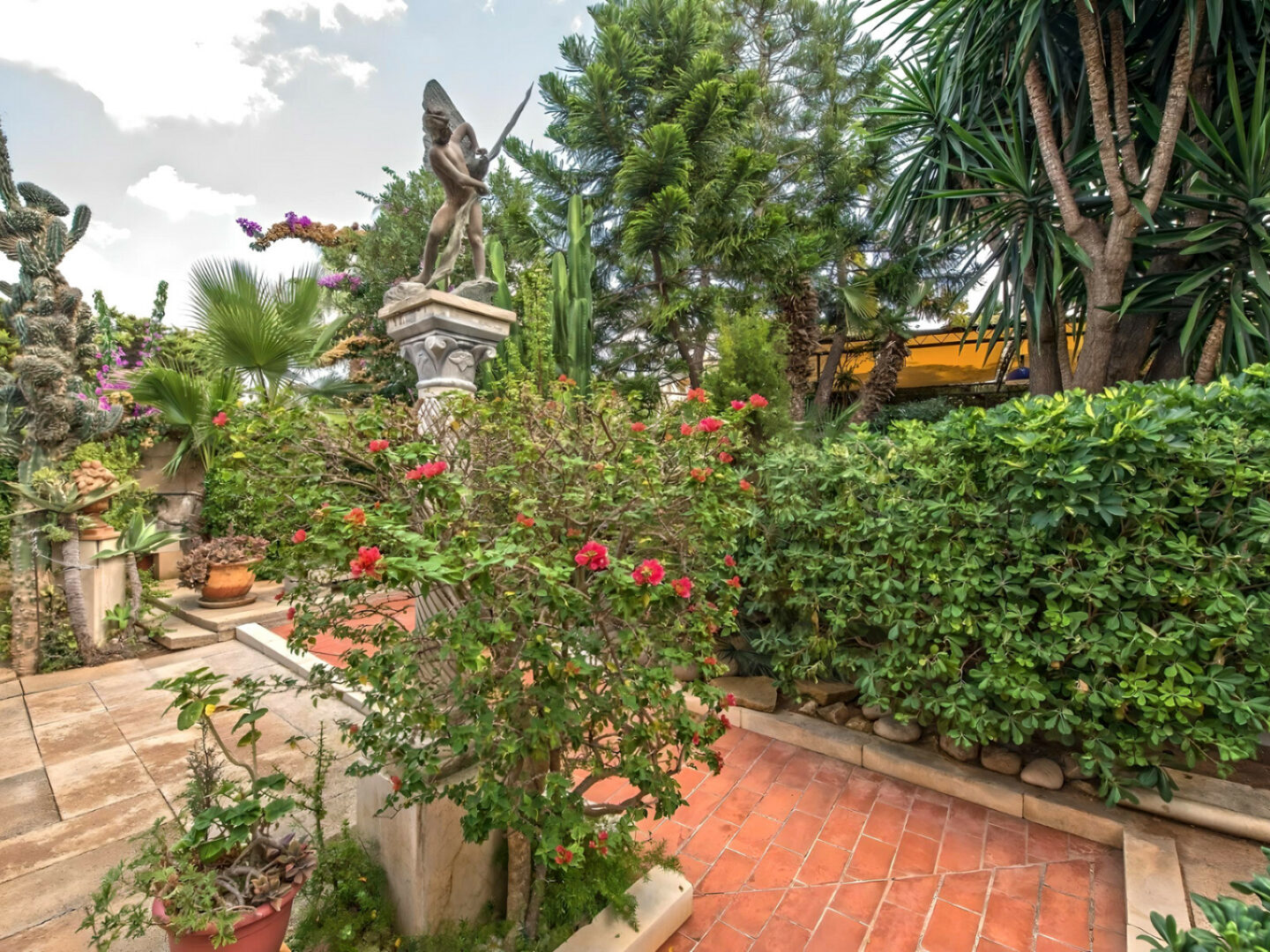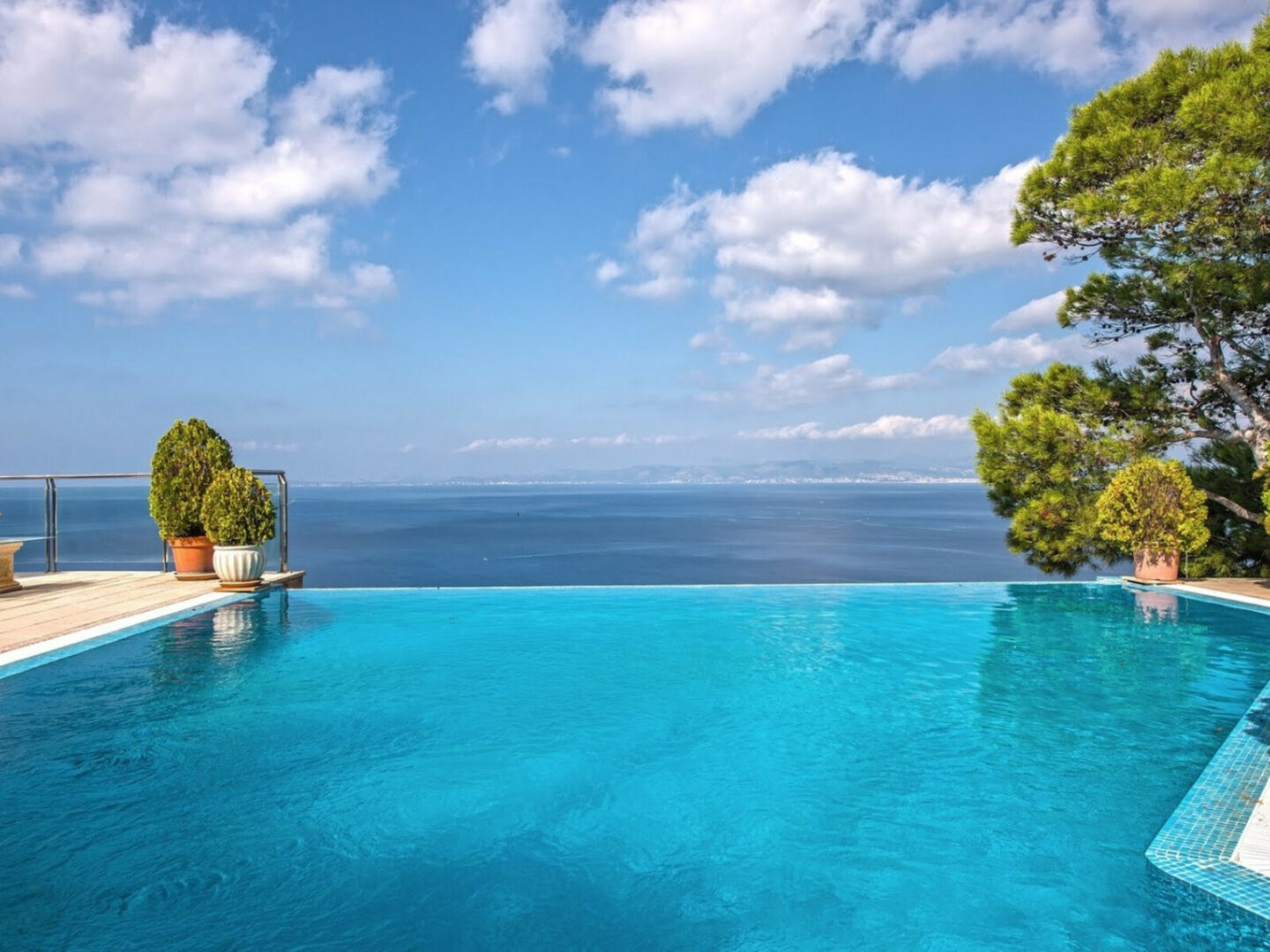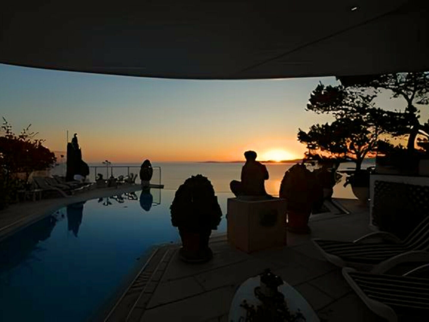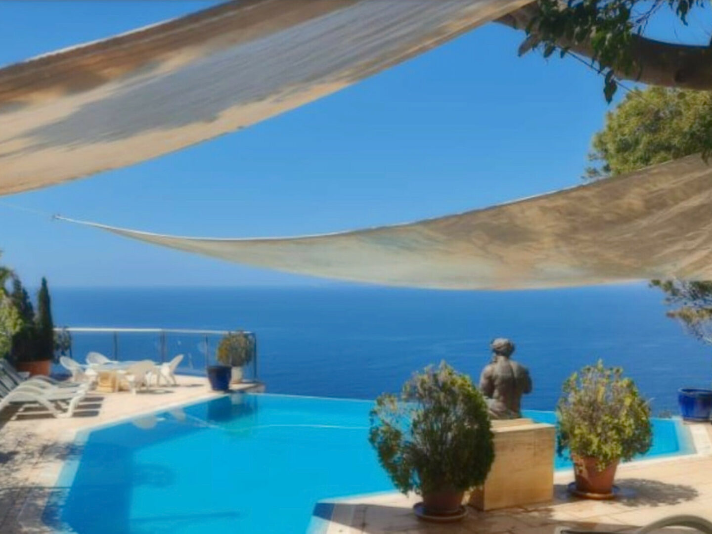 Im Außenbereich lädt ein liebevoll gestalteter Garten mit Skulpturen, mehrere Terrassen mit Meerblick und ein eindrucksvoller Infinity-Pool zum Entspannen ein. Außerdem verfügt die Villa über eine Garage und Außenstellplätze.