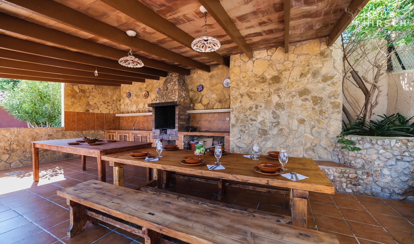 Auf der Rückseite der Villa befindet sich eine 40 m² große überdachte Terrasse mit Sommerküche und Grillbereich, ideal für gesellige Abende im Freien. Gleich daneben lädt ein Wellnessbereich mit Blick auf einen charmanten andalusischen Patio zum Entspannen ein.