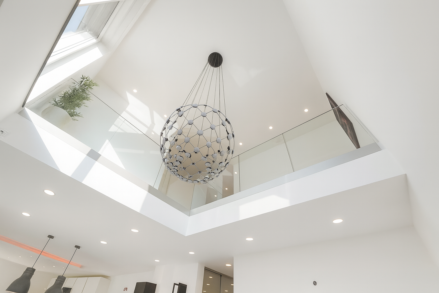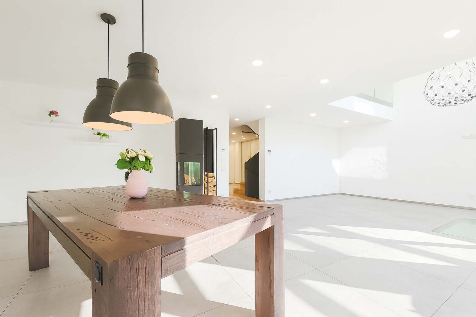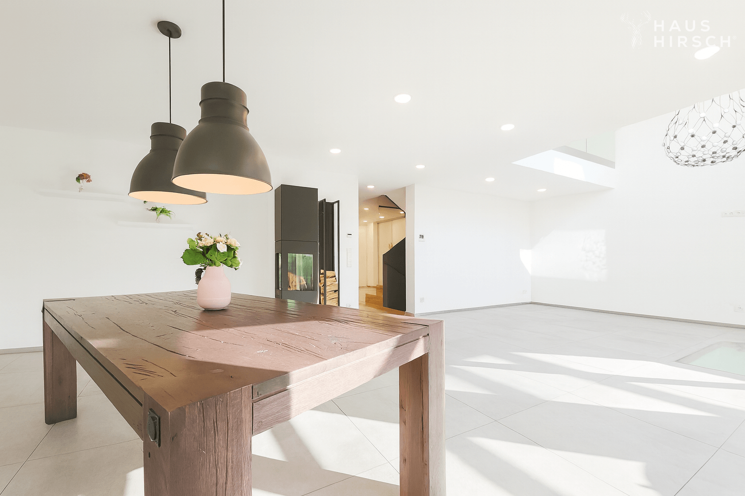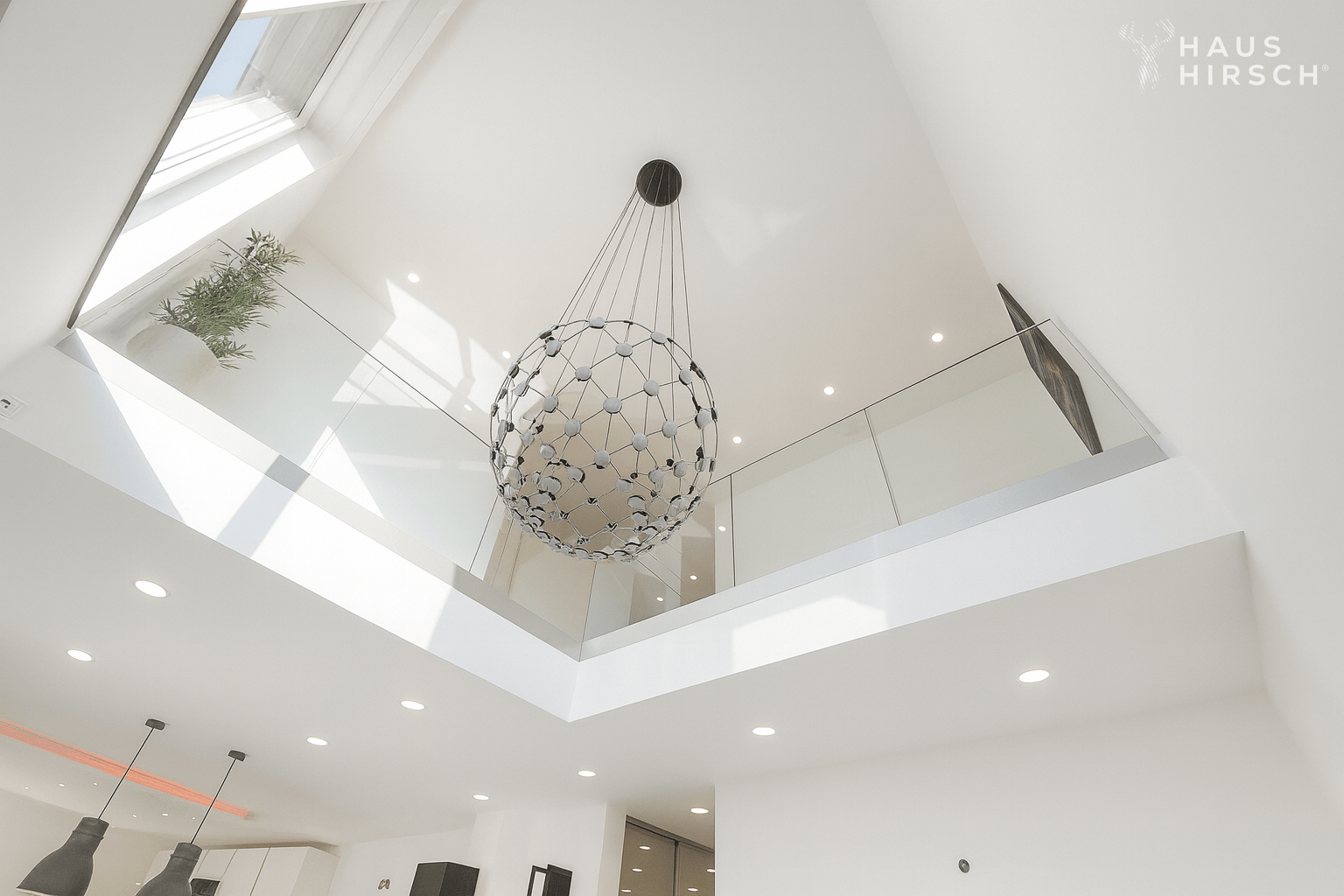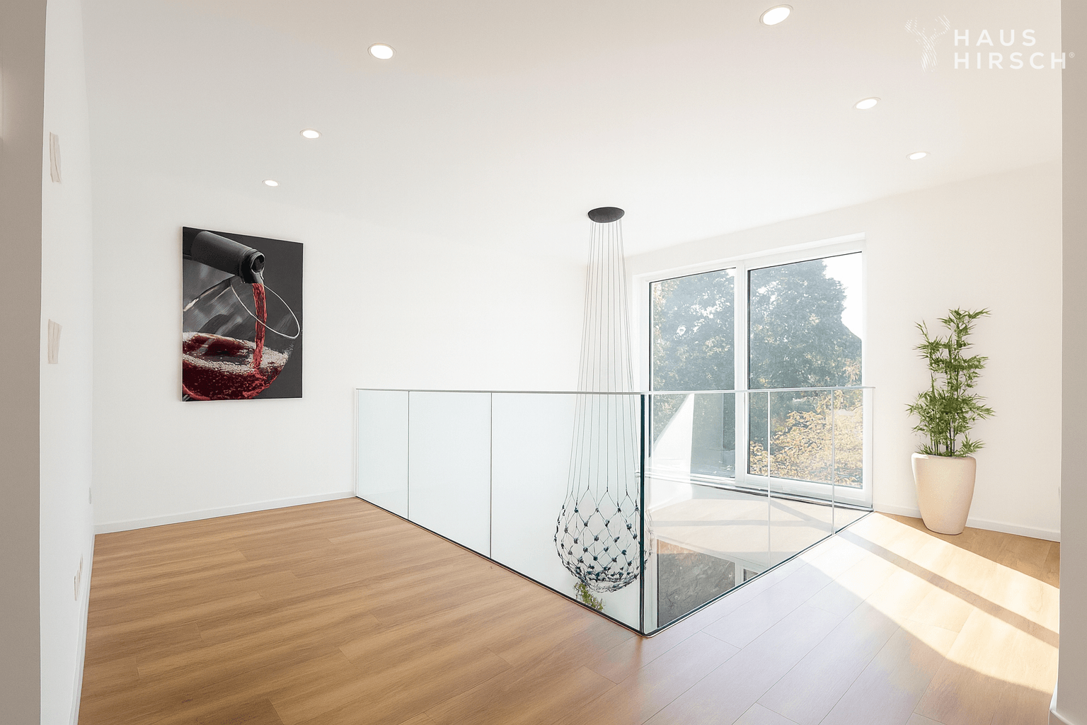 Das Haupthaus umfasst rund 235 m² Wohnfläche. Neben dem großzügigen Wohn- und Esszimmer mit offenem Raumkonzept stehen hier vier Schlafzimmer, zwei stilvoll gestaltete Badezimmer, ein Gäste-WC und vier großzügige Kellerräume zur Verfügung. Ein beeindruckender Luftraum, der sich vom 1. Obergeschoss bis ins Erdgeschoss öffnet, verleiht dem Wohnbereich eine einzigartige Großzügigkeit. Ein architektonisches Highlight ist zudem die mit Glas geschlossene Öffnung im Wohnzimmer, durch die Sie direkt in den edlen Weinkeller blicken können.