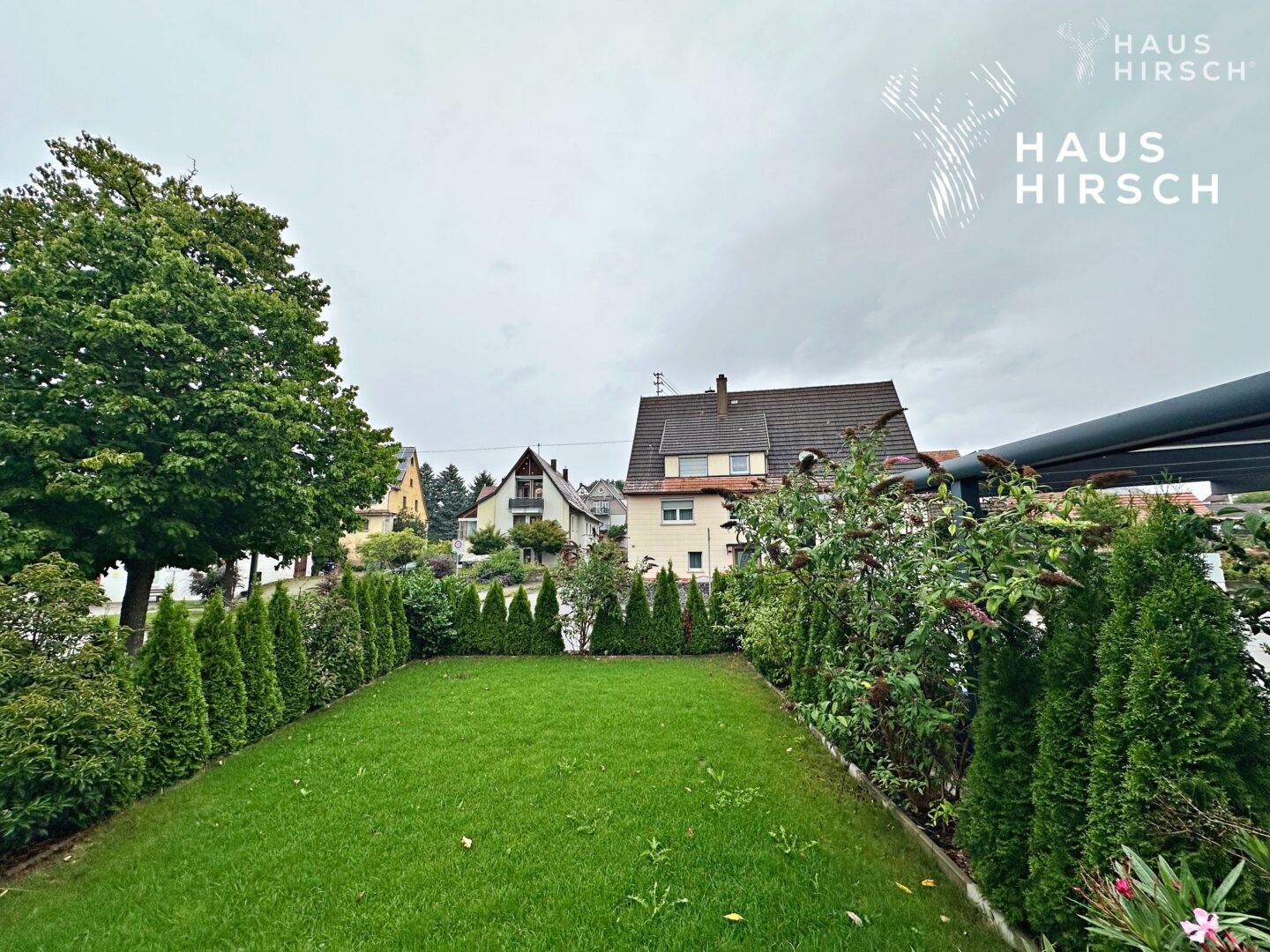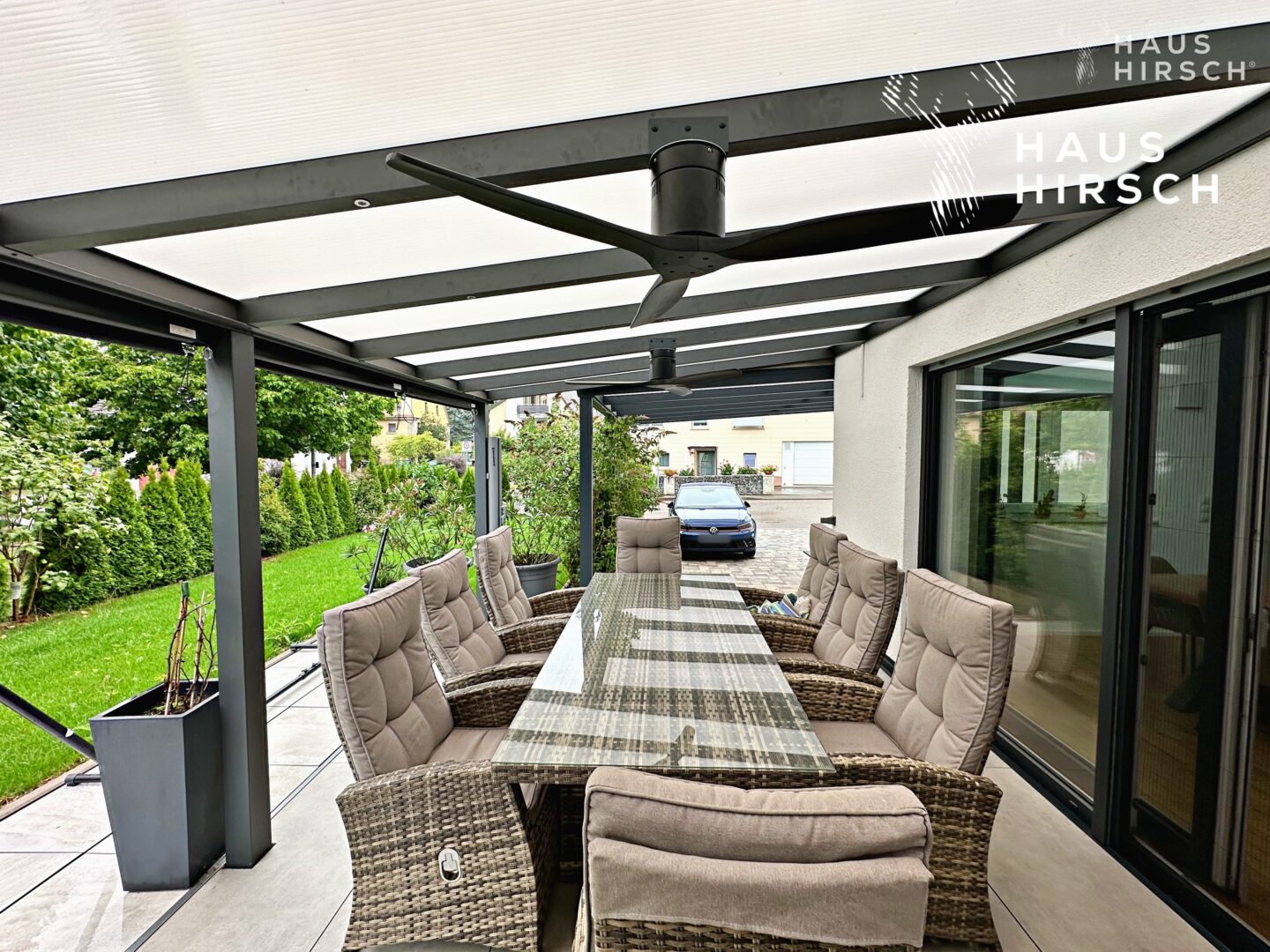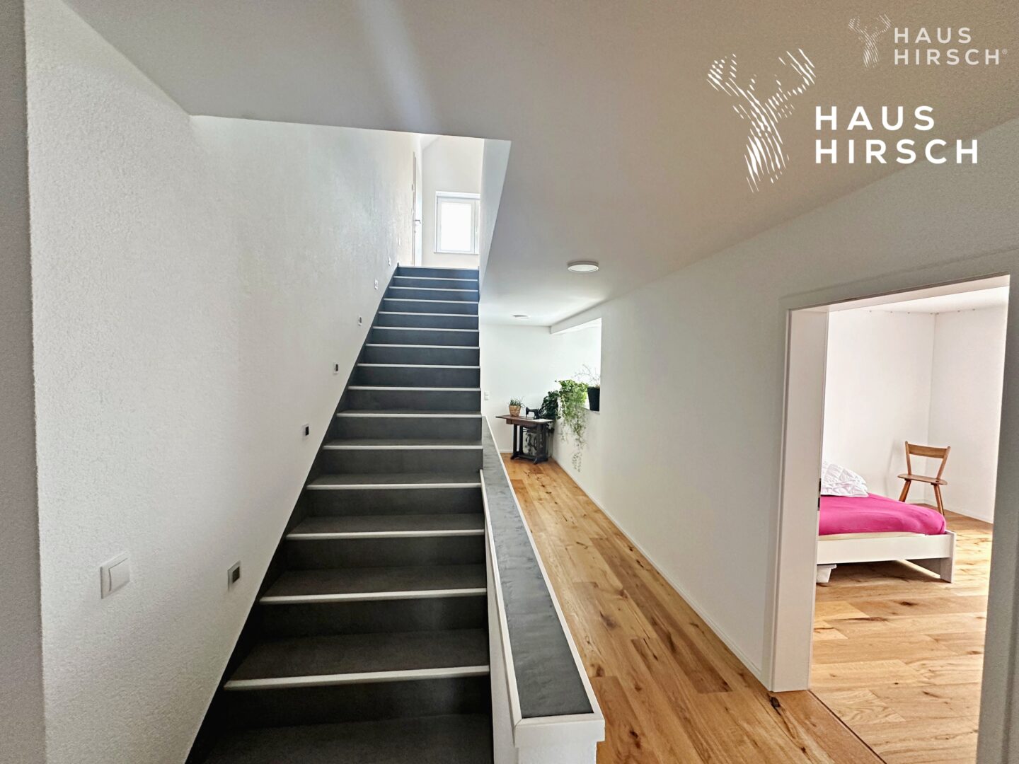 Im Obergeschoss stehen fünf Zimmer, ein großzügiges Tageslichtbad und eine sonnige Dachterrasse mit Kassettenmarkise zur Verfügung.