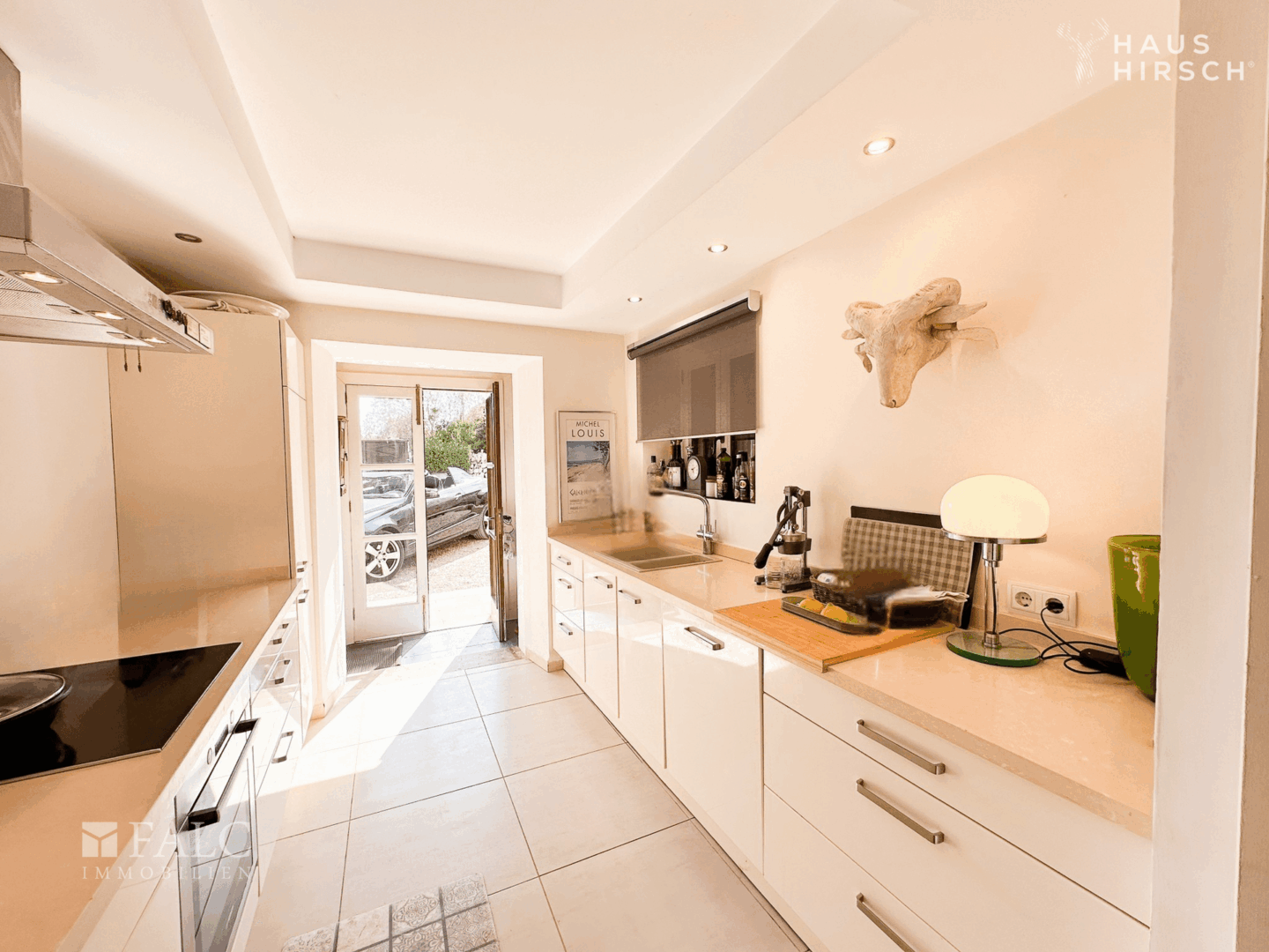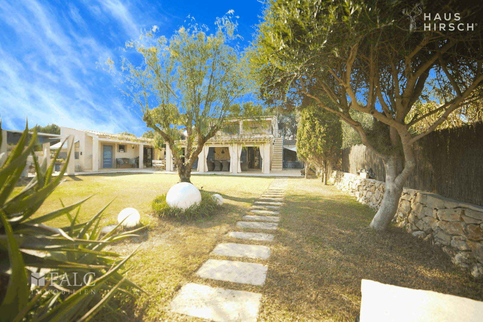 Besonderes Highlight ist die großzügige, überdachte Terrasse, die nahtlos in den Außenbereich übergeht. Hier öffnen sich traumhafte Blickachsen in den mediterranen Garten, der mit Oliven und duftenden Pflanzen das pure Lebensgefühl der Insel widerspiegelt.