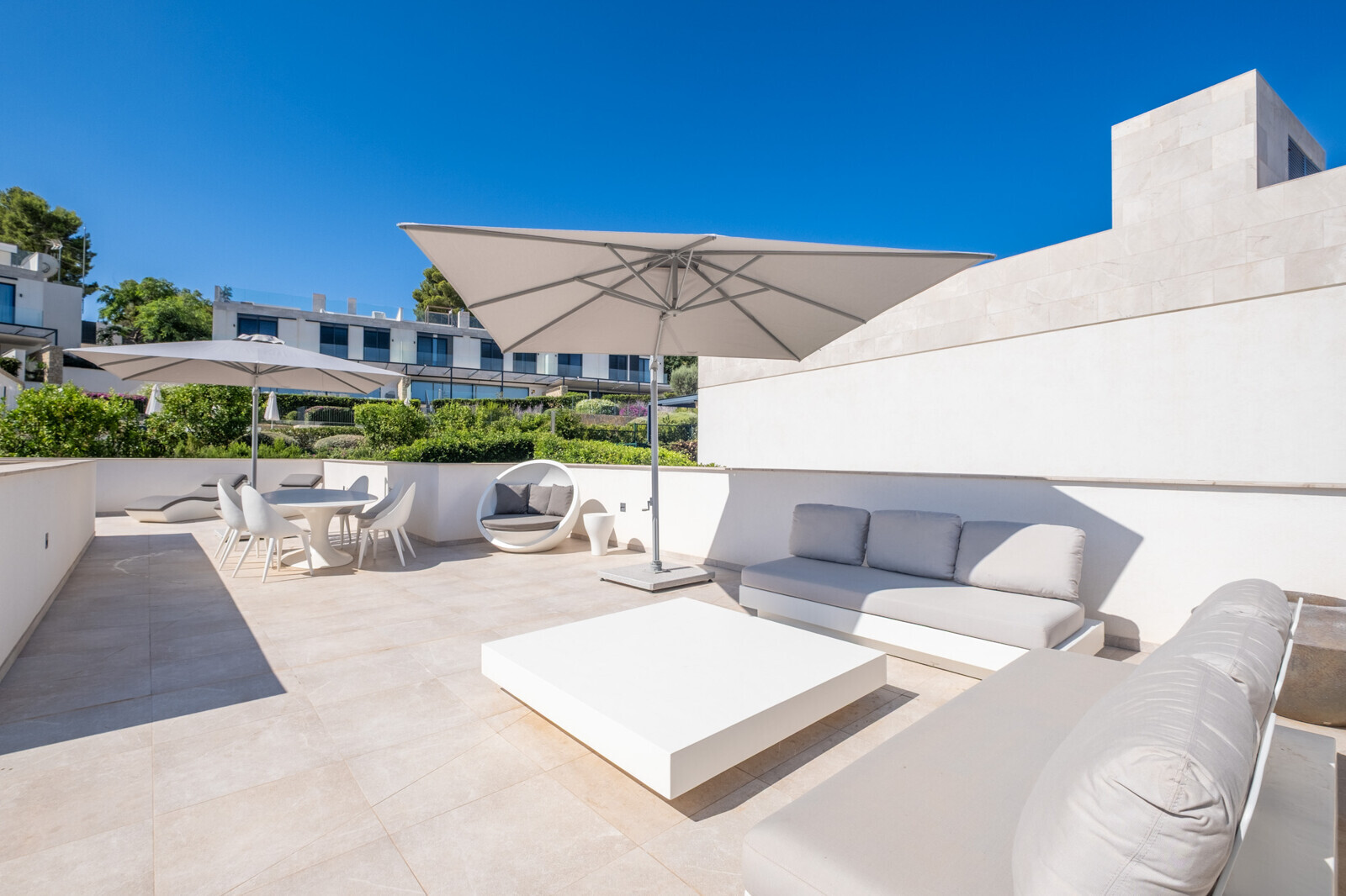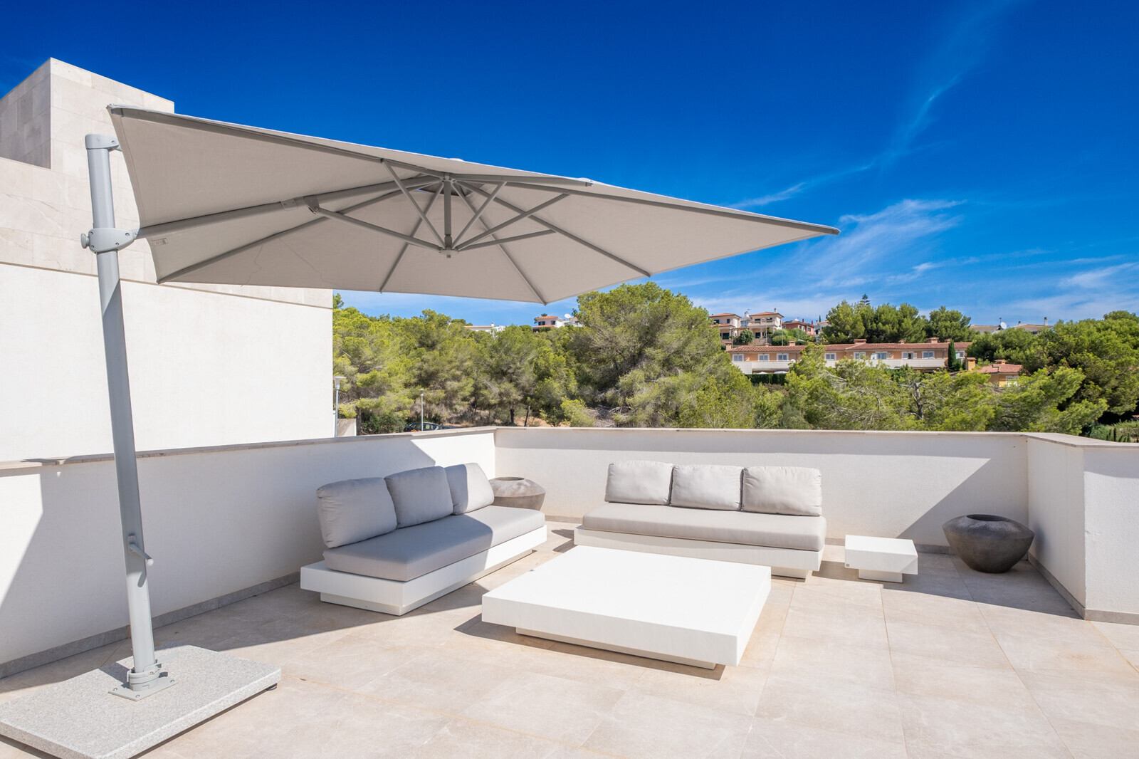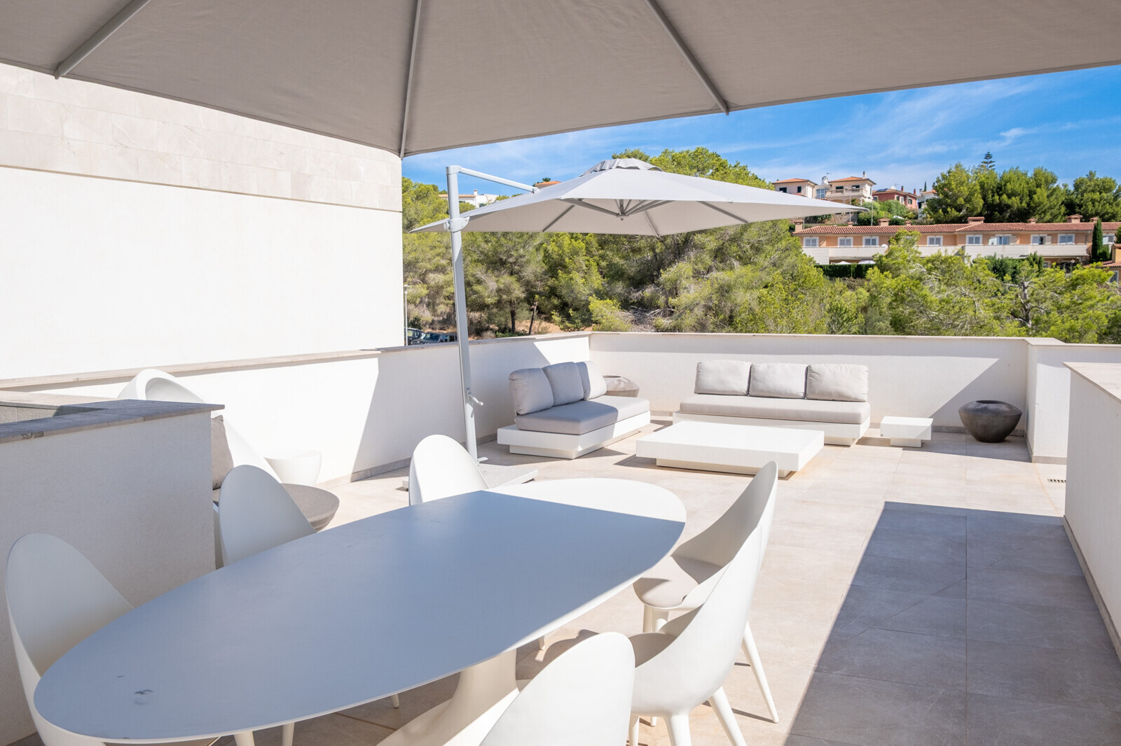 Der Außenbereich präsentiert sich mit einem malerischen Patio, der von einem imposanten Olivenbaum geschmückt wird. Ein privater Pool lädt zu erfrischenden Schwimmeinheiten ein, während der private Garten und die schöne Gartenanlage Ruhe und Entspannung versprechen. Darüber hinaus können Sie auch den Gemeinschaftspool nutzen und die Sonne auf der Terrasse oder der Dachterrasse genießen.