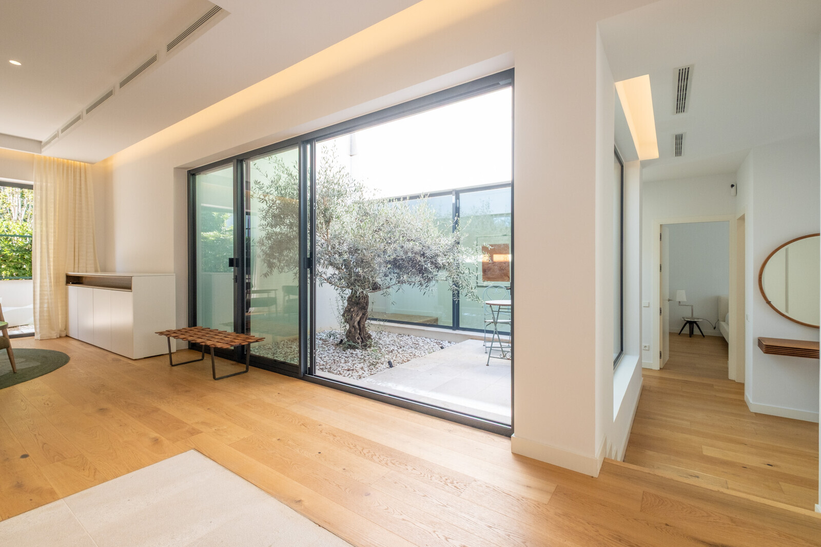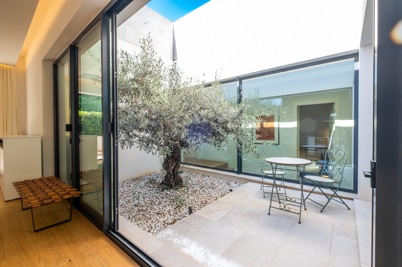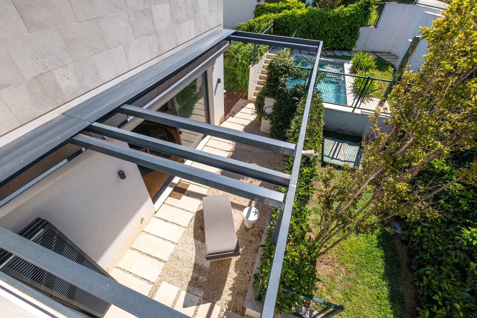 Der Außenbereich präsentiert sich mit einem malerischen Patio, der von einem imposanten Olivenbaum geschmückt wird. Ein privater Pool lädt zu erfrischenden Schwimmeinheiten ein, während der private Garten und die schöne Gartenanlage Ruhe und Entspannung versprechen. Darüber hinaus können Sie auch den Gemeinschaftspool nutzen und die Sonne auf der Terrasse oder der Dachterrasse genießen.