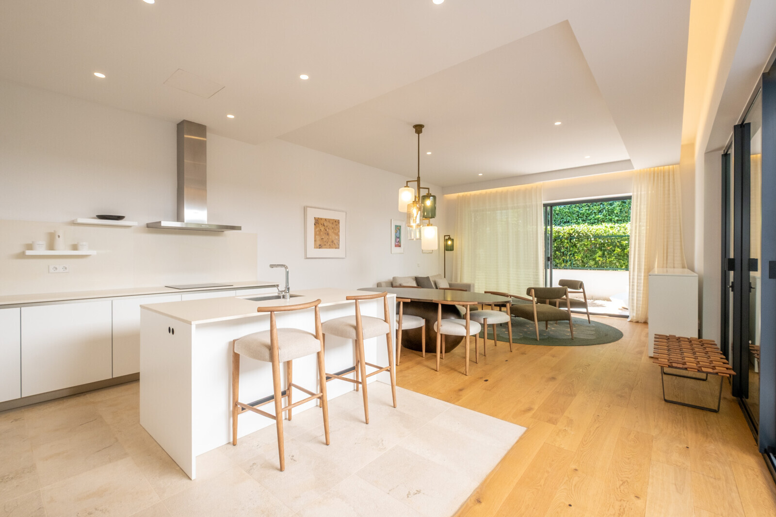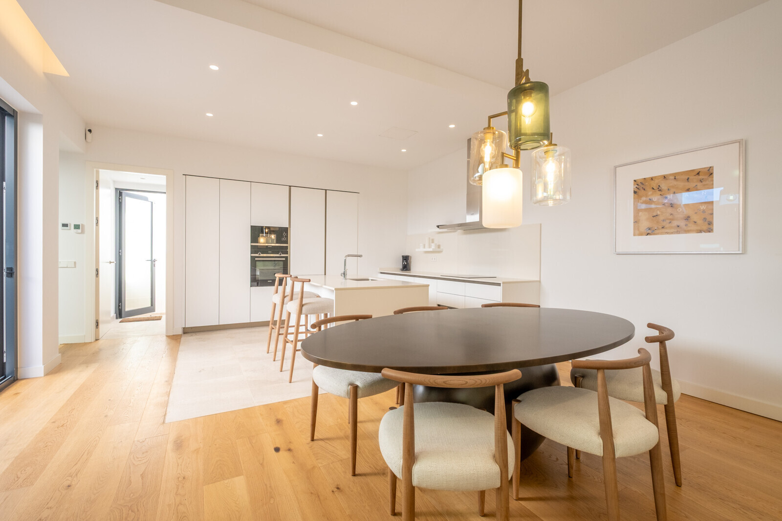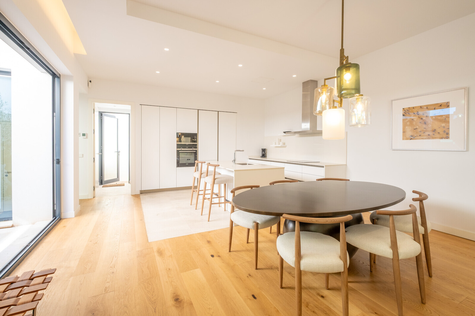 Treten Sie ein in Ihr neues Zuhause und lassen Sie sich von der modernen Eleganz dieses freistehenden Hauses verzaubern. Das großzügige Wohn- und Esszimmer mit der offenen, modernen Bulthaup-Küche lädt zu entspannten Abenden mit Familie und Freunden ein. Die Eichenböden verleihen dem Raum eine warme Atmosphäre, während die Fußbodenheizung für behagliche Wärme sorgt.