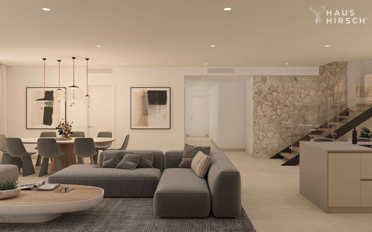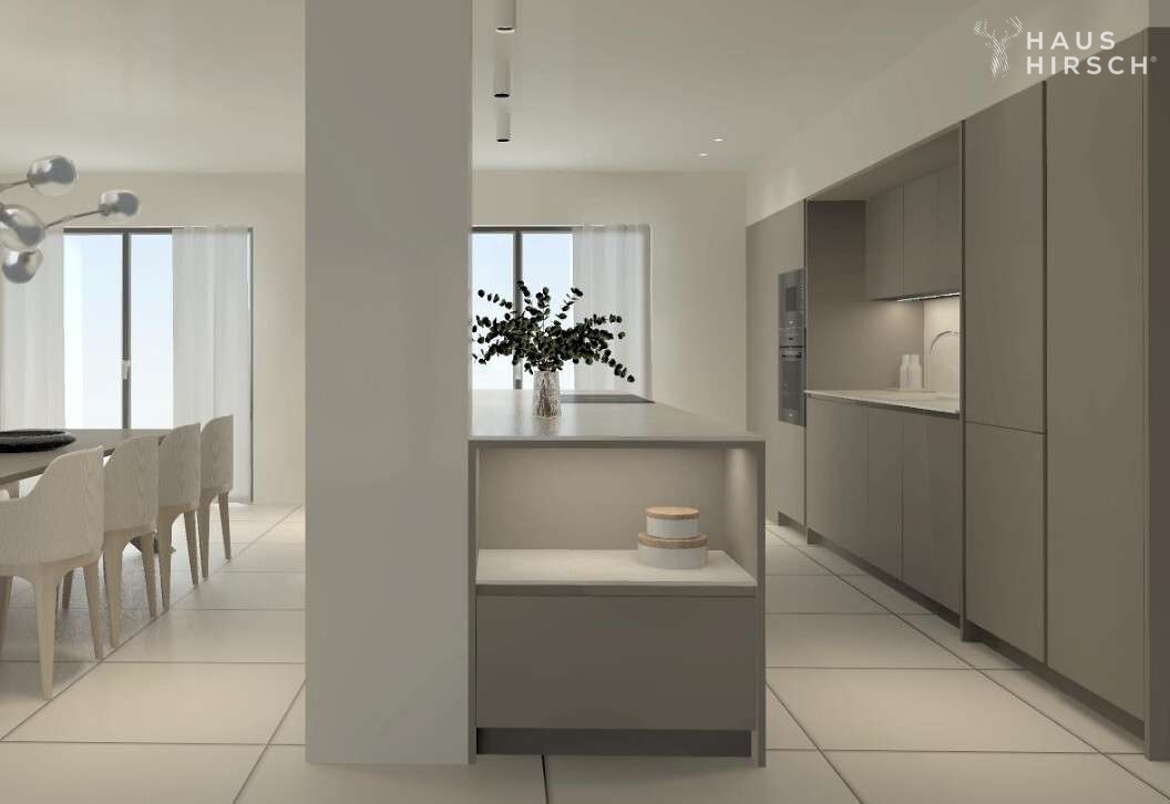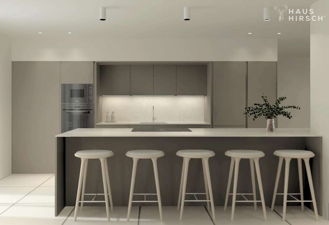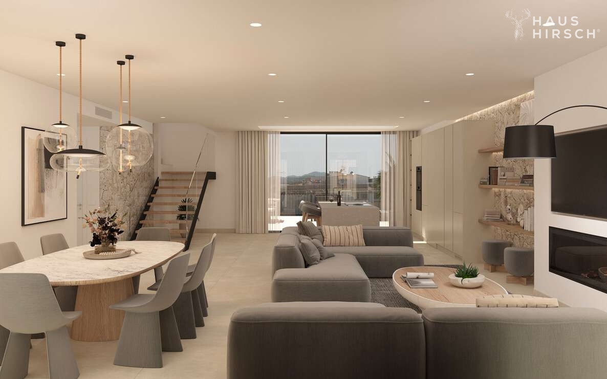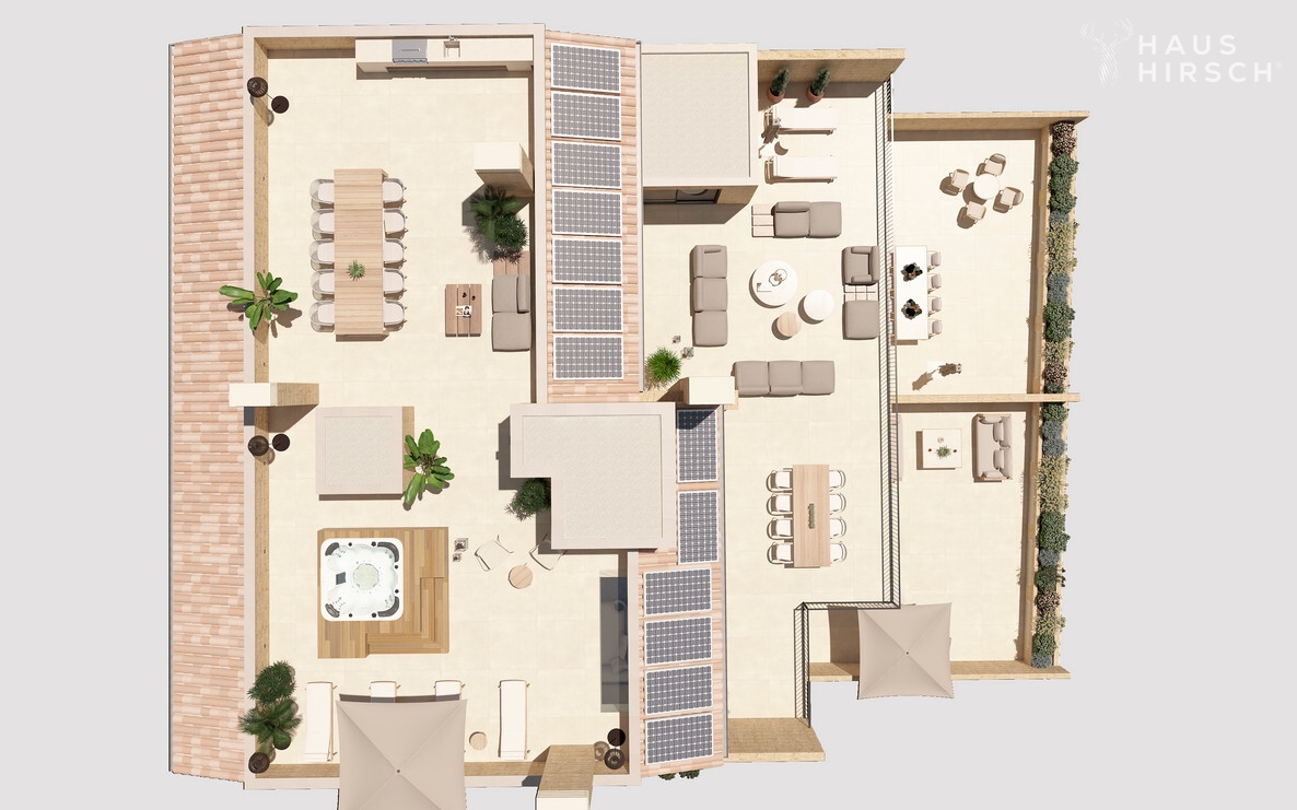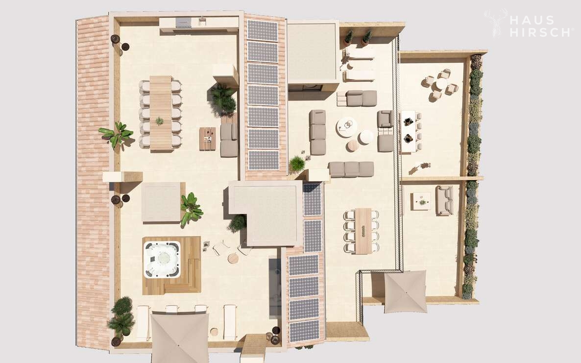 Die gehobene Ausstattung der Wohnung lässt keine Wünsche offen. Ein Highlight ist der offene Wohn- und Essbereich mit einer offen gestaltenen und voll ausgestatteten Einbauküche. Von hier aus geht es ebenfalls direkt hinaus auf die große Terrasse, auf der Sie die Sonne und die Ruhe genießen können. Über eine innenliegende Treppe gelangt man zudem vom Wohnzimmer auf die große Dachterrasse. Hier ist Platz für einen großen Esstisch, eine Outdoorküche und weitere Sonnenliegen.