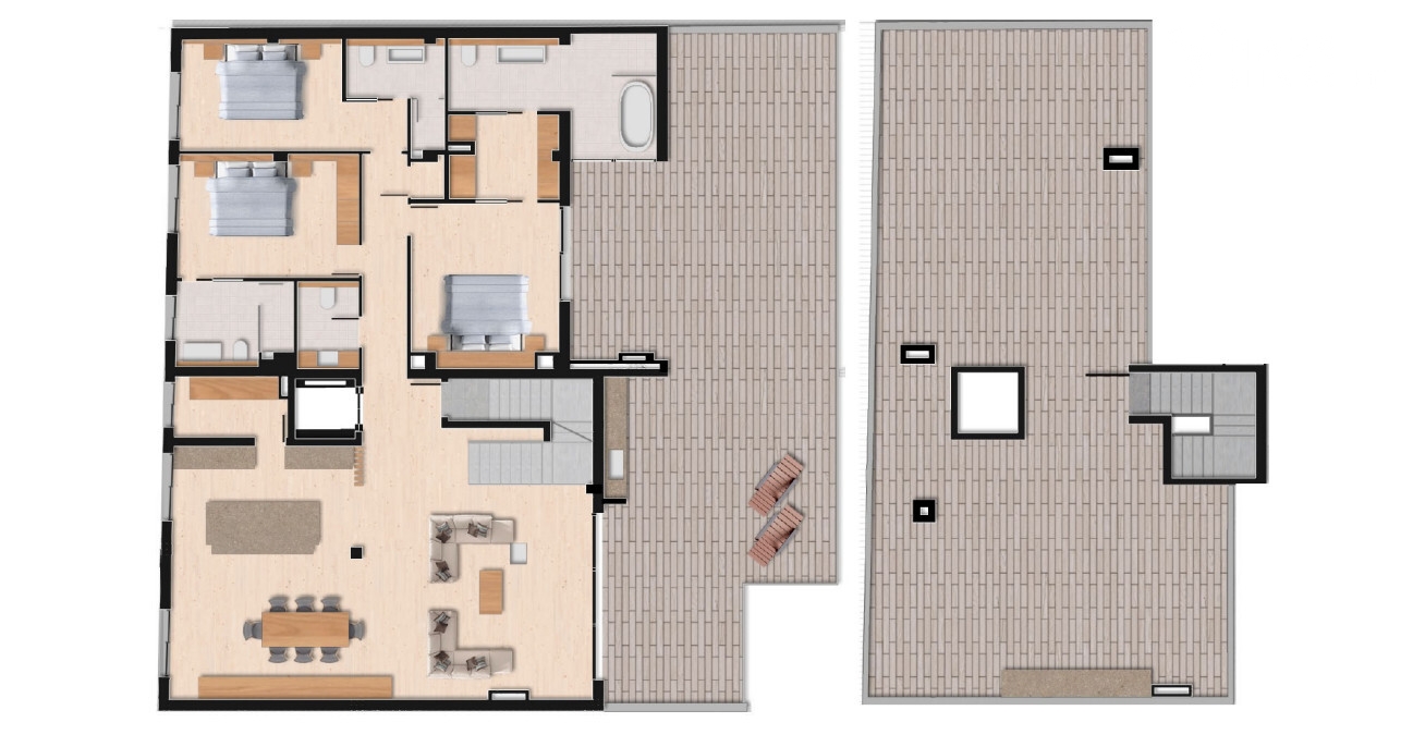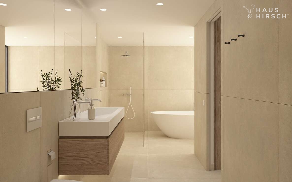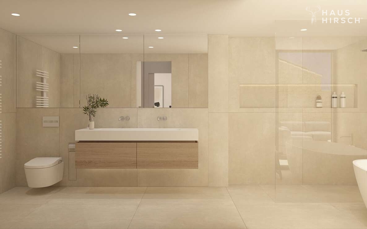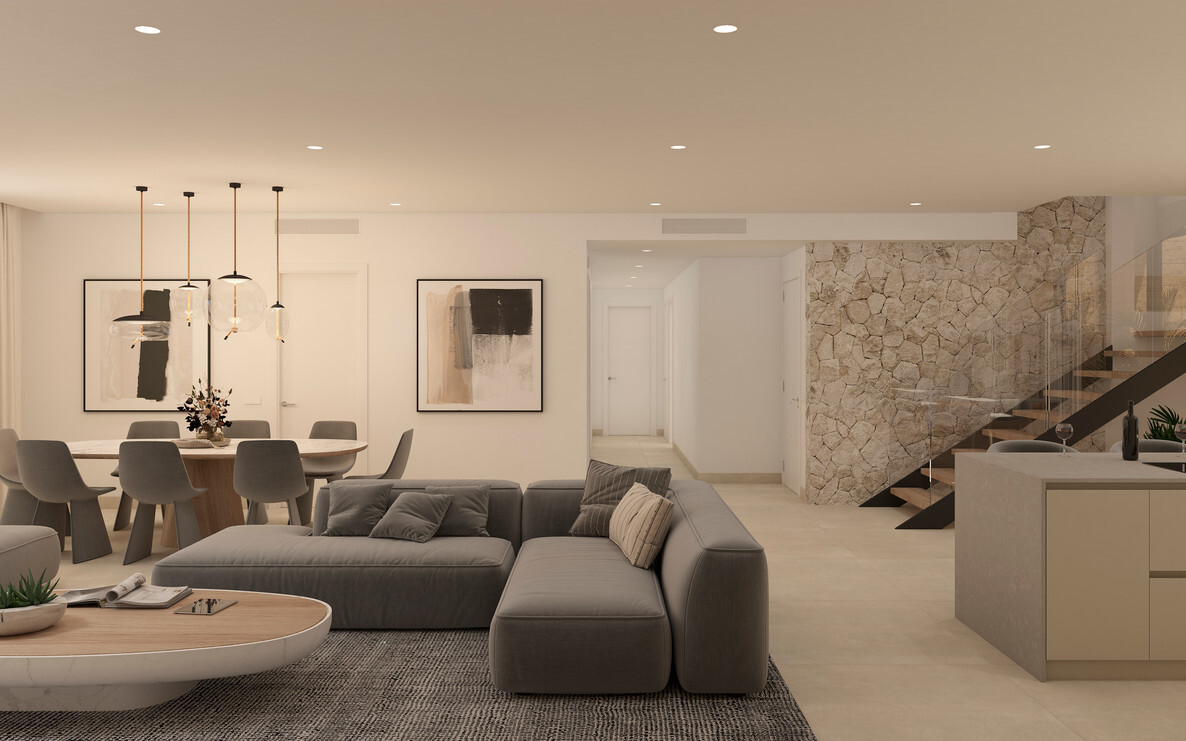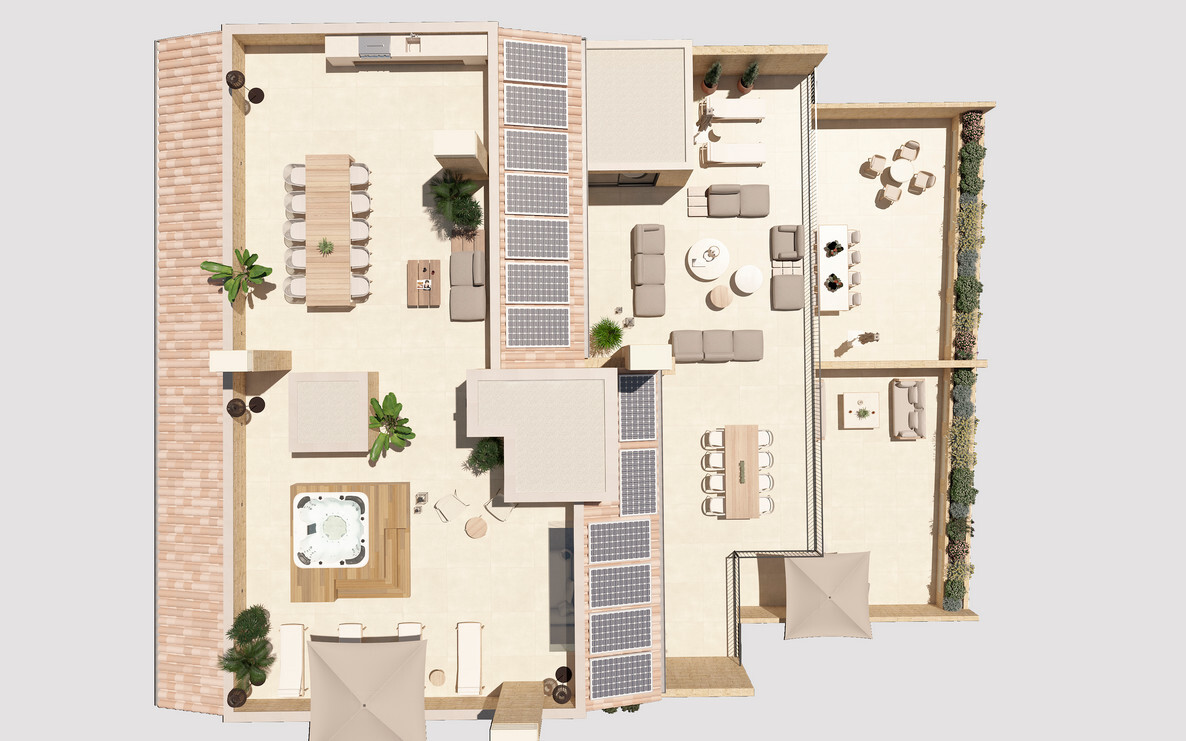 Die gehobene Ausstattung der Wohnung lässt keine Wünsche offen. Ein Highlight ist der offene Wohn- und Essbereich mit einer offen gestaltenen und voll ausgestatteten Einbauküche. Von hier aus geht es ebenfalls direkt hinaus auf die große Terrasse, auf der Sie die Sonne und die Ruhe genießen können. Über eine innenliegende Treppe gelangt man zudem vom Wohnzimmer auf die große Dachterrasse. Hier ist Platz für einen großen Esstisch, eine Outdoorküche und weitere Sonnenliegen.