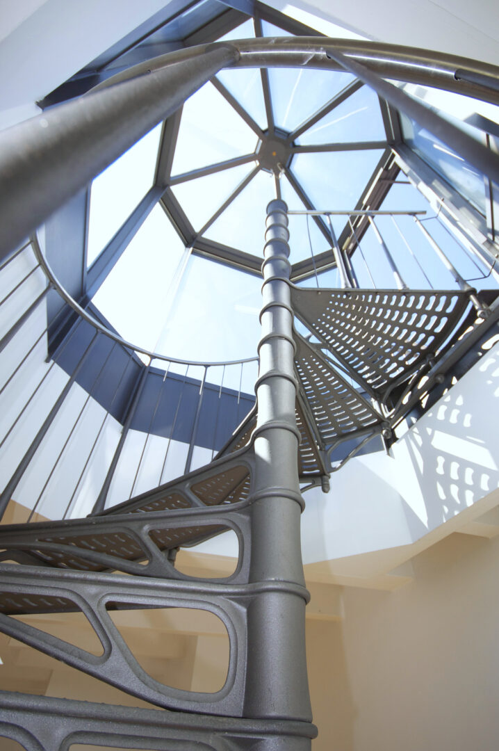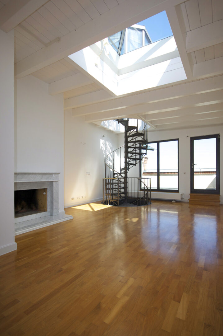 Die Etagen der Wohnung sind durch zwei elegante Stahlwendeltreppen miteinander verbunden. Auf der dritten Etage erwartet Sie ein Zimmer mit Kamin und Wendeltreppe, eine Gästeküche, ein Wohnzimmer, Gästezimmer, Bäder und mehr. Die vierte Etage bietet eine Galerie mit Blick auf das Kaminzimmer, Schlafzimmer, Bäder, Ankleide und eine weitere Galerie.