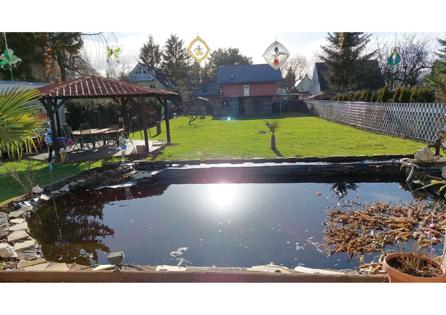 Garten-Oase: Professionell angelegter Garten mit Fischteich und überdachter Sonnenterrasse.