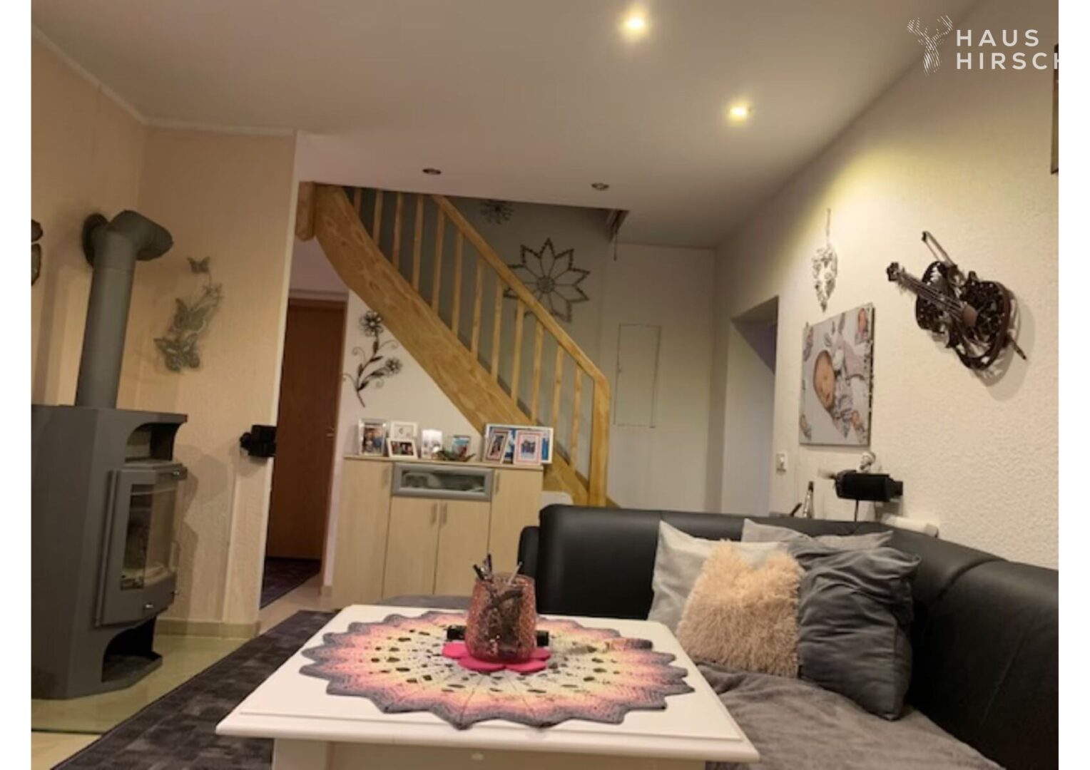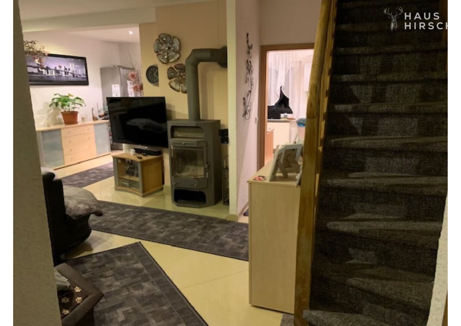 Wohlfühl-Ambiente: Lichtdurchflutetes Wohnzimmer mit gemütlichem Kaminofen.