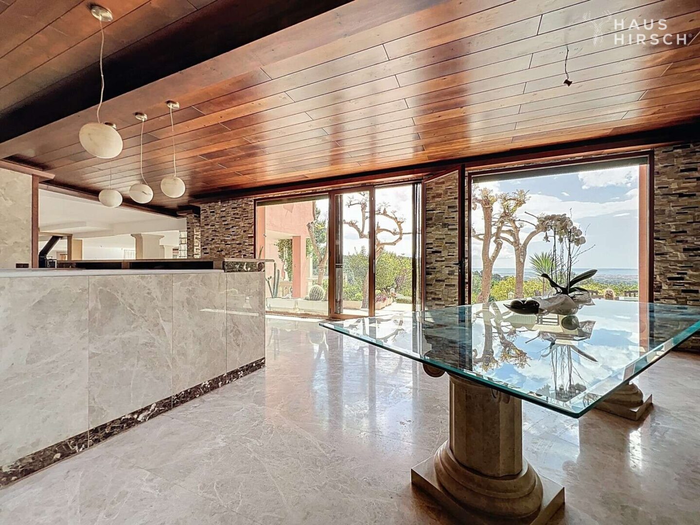 Geräumige Wohnzimmer mit Zugang zu Terrassen und Außenbereichen.
