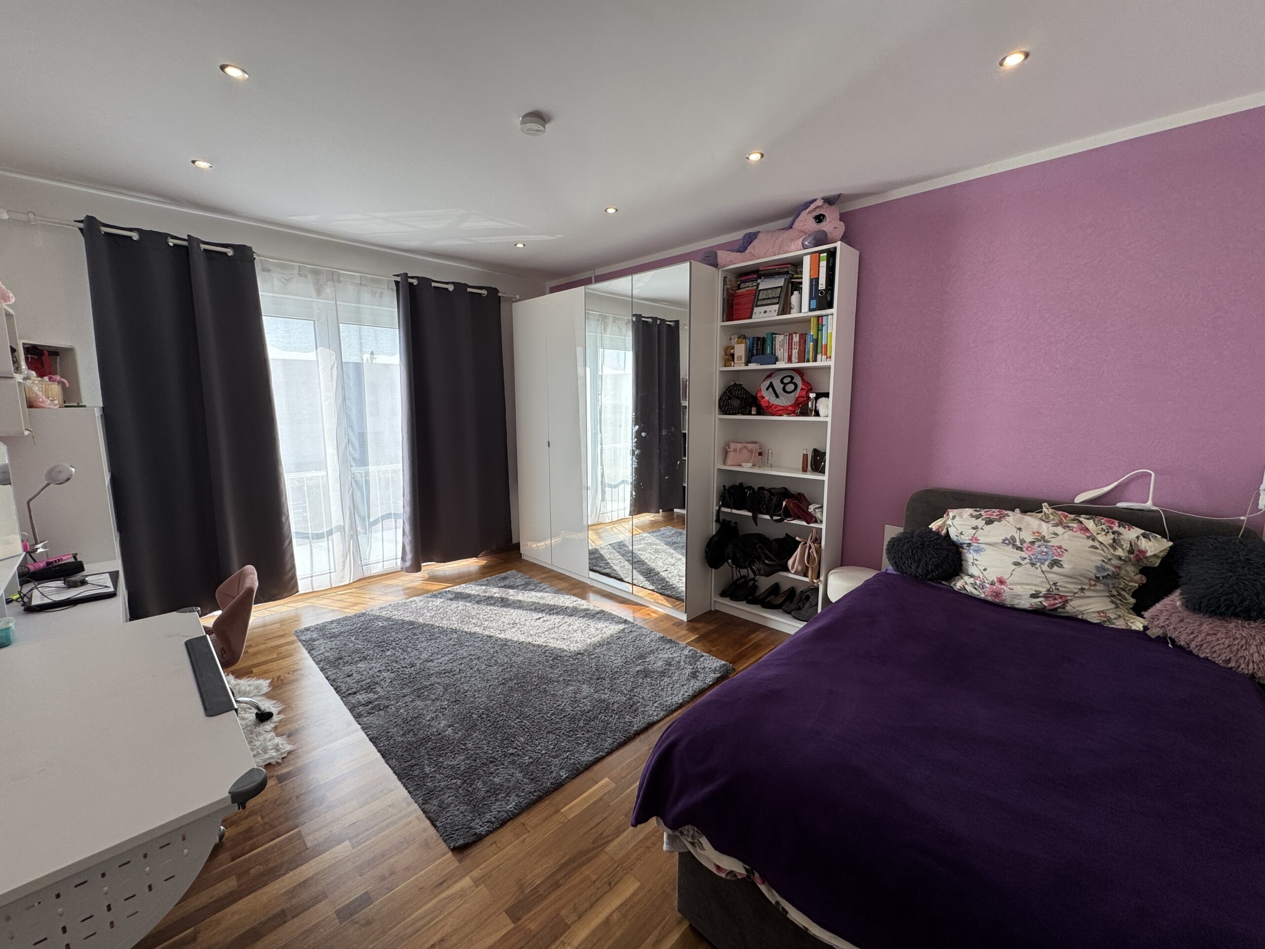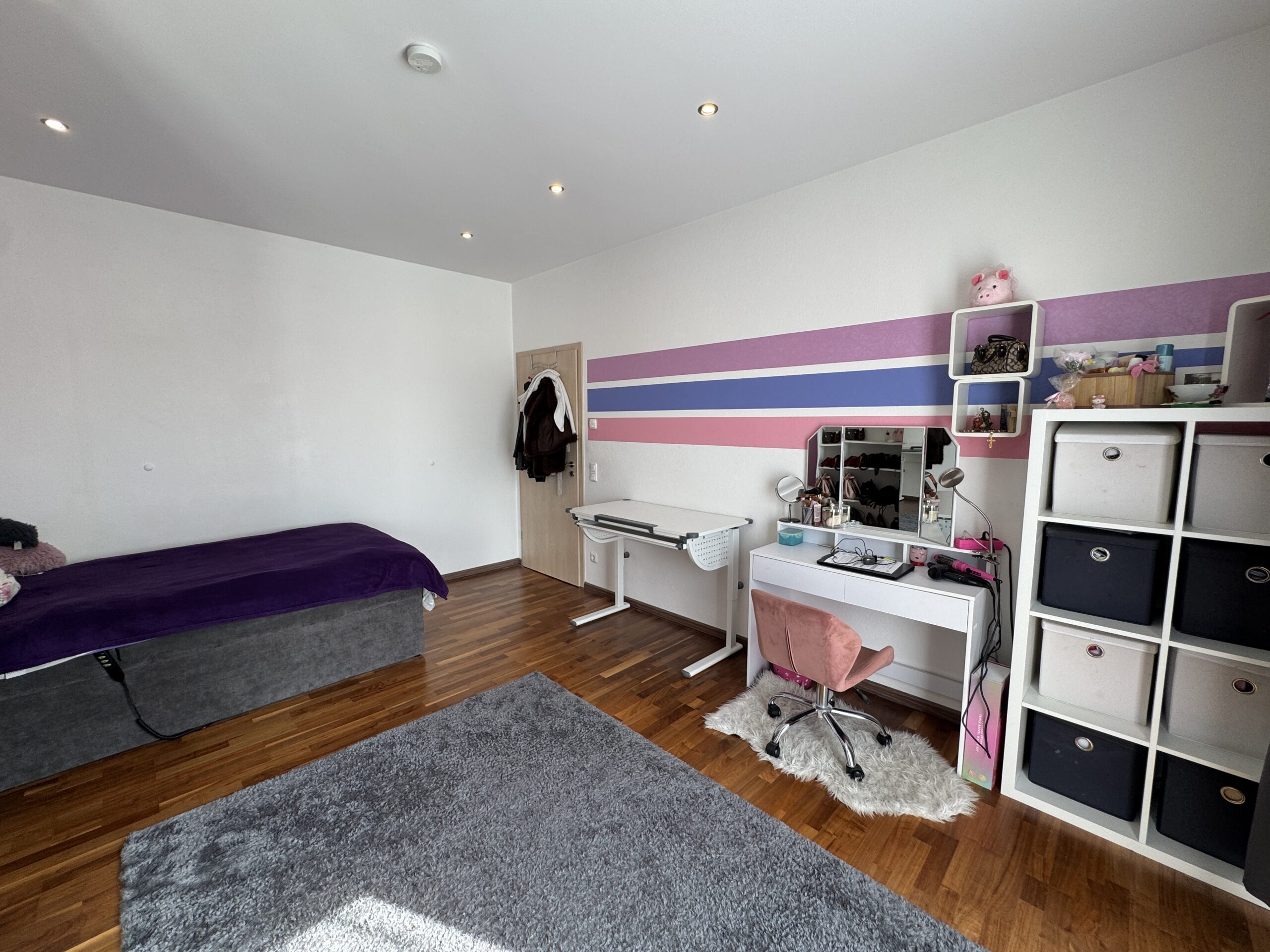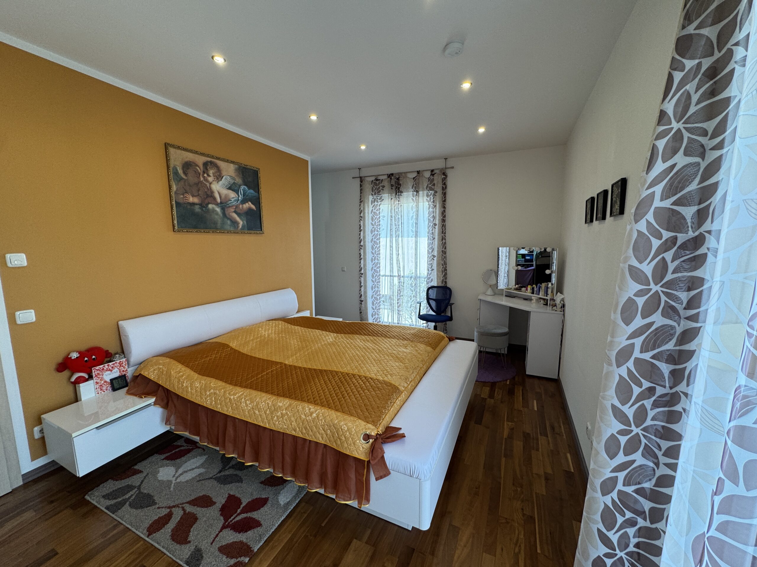 Das Elternschlafzimmer besticht zusätzlich durch seinen begehbaren Kleiderschrank.