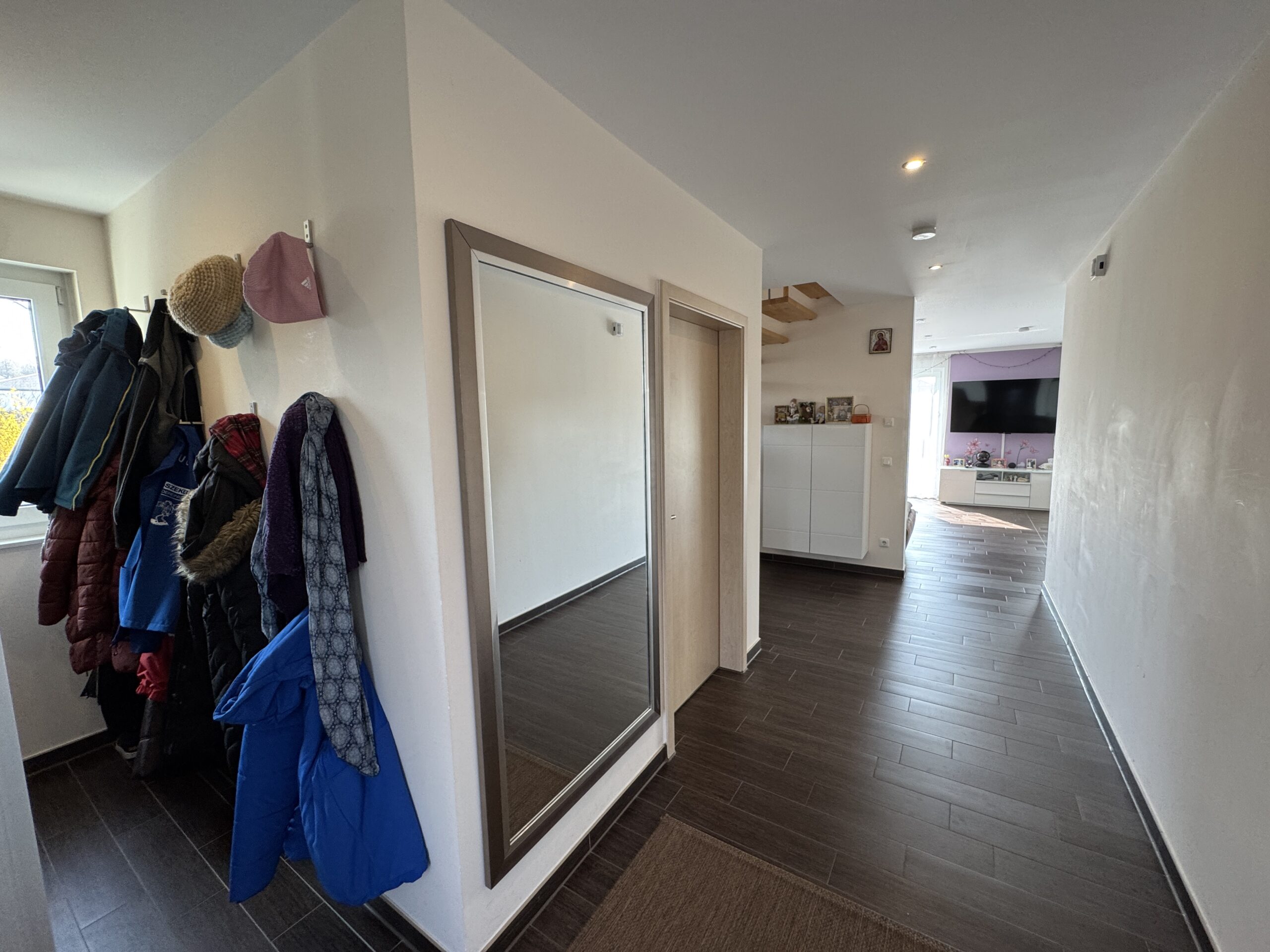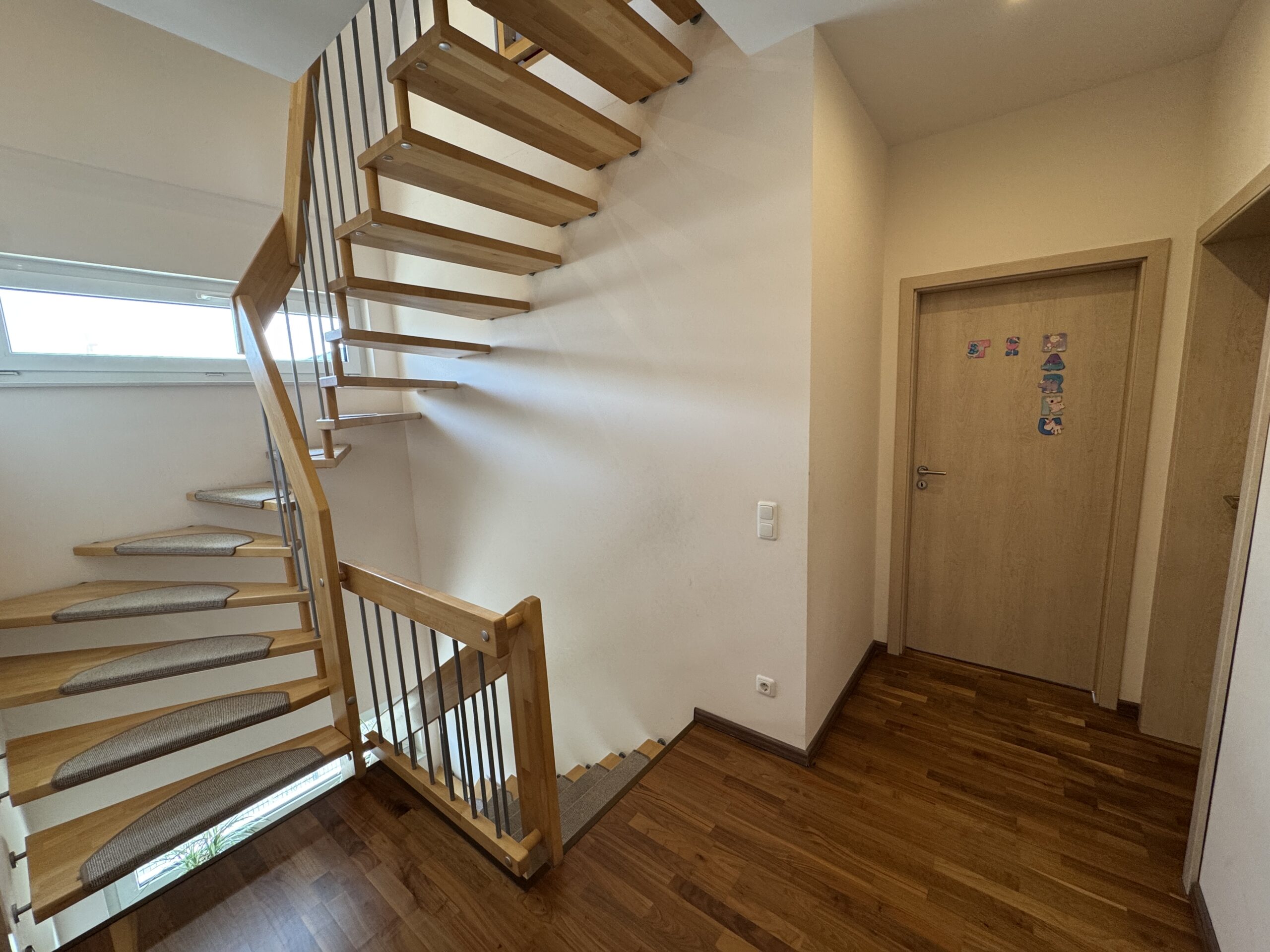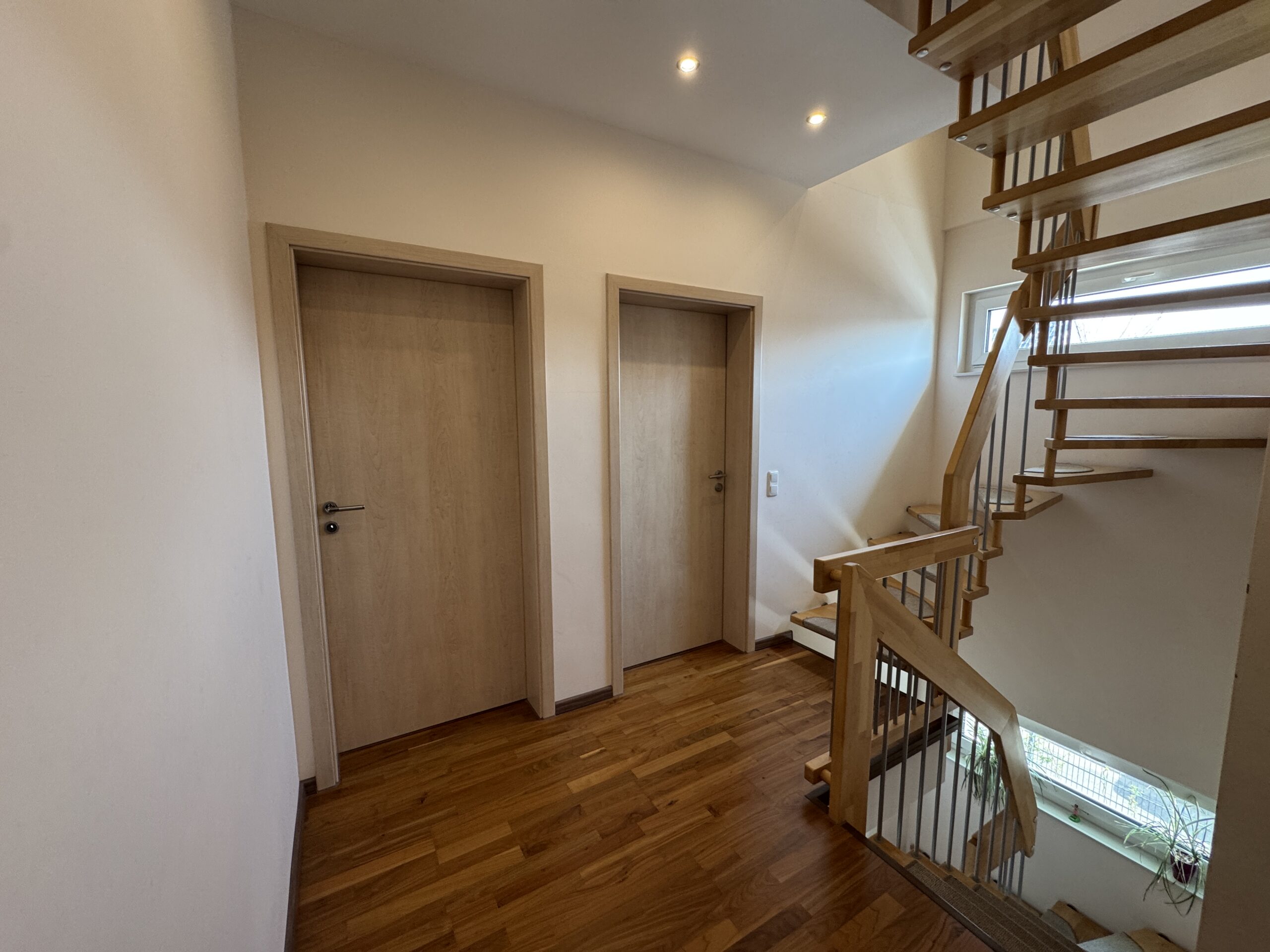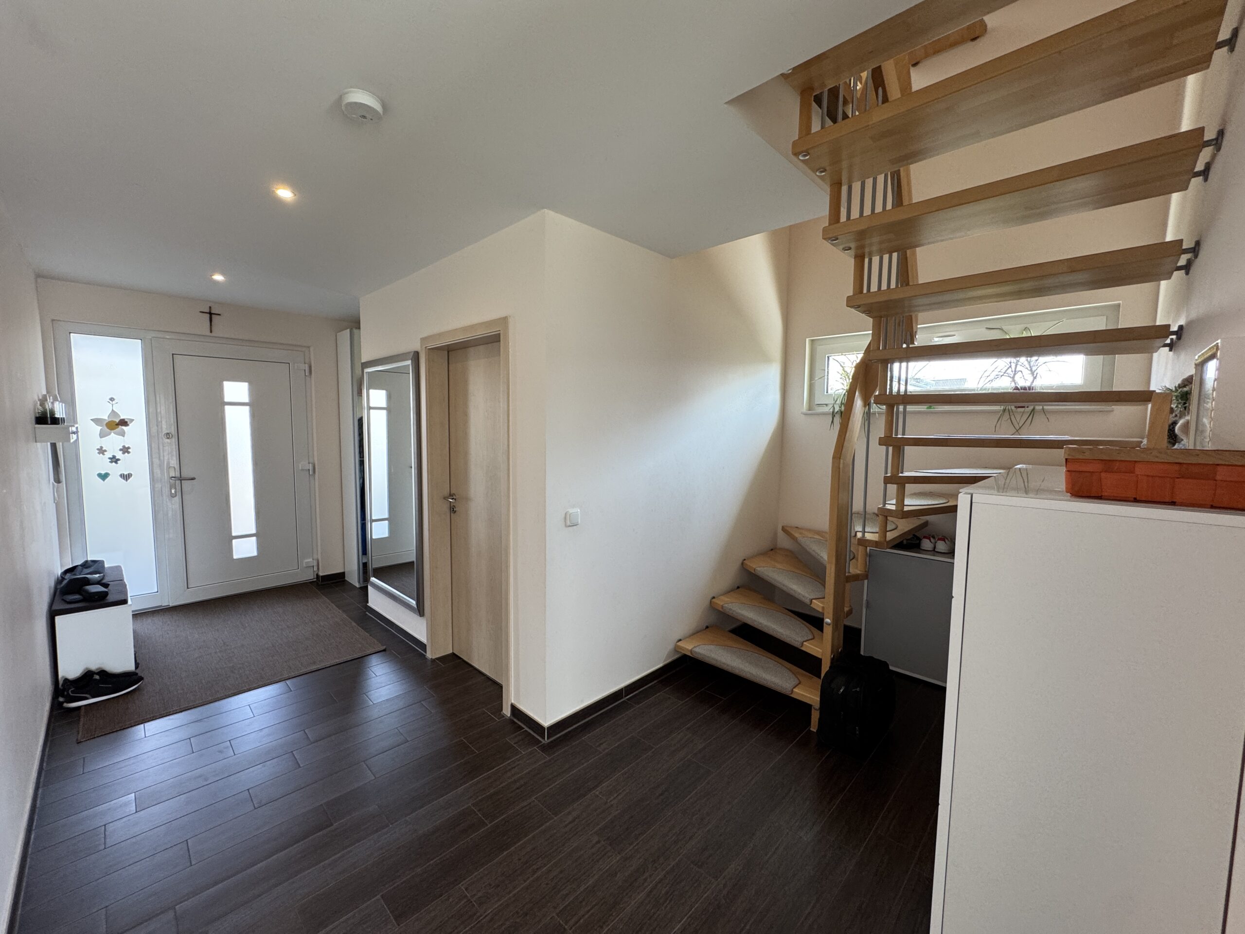 Die Fenster sind dreifach verglast und sorgen für eine optimale Wärmeisolierung. Die Türen sind stabil und modern gestaltet.
