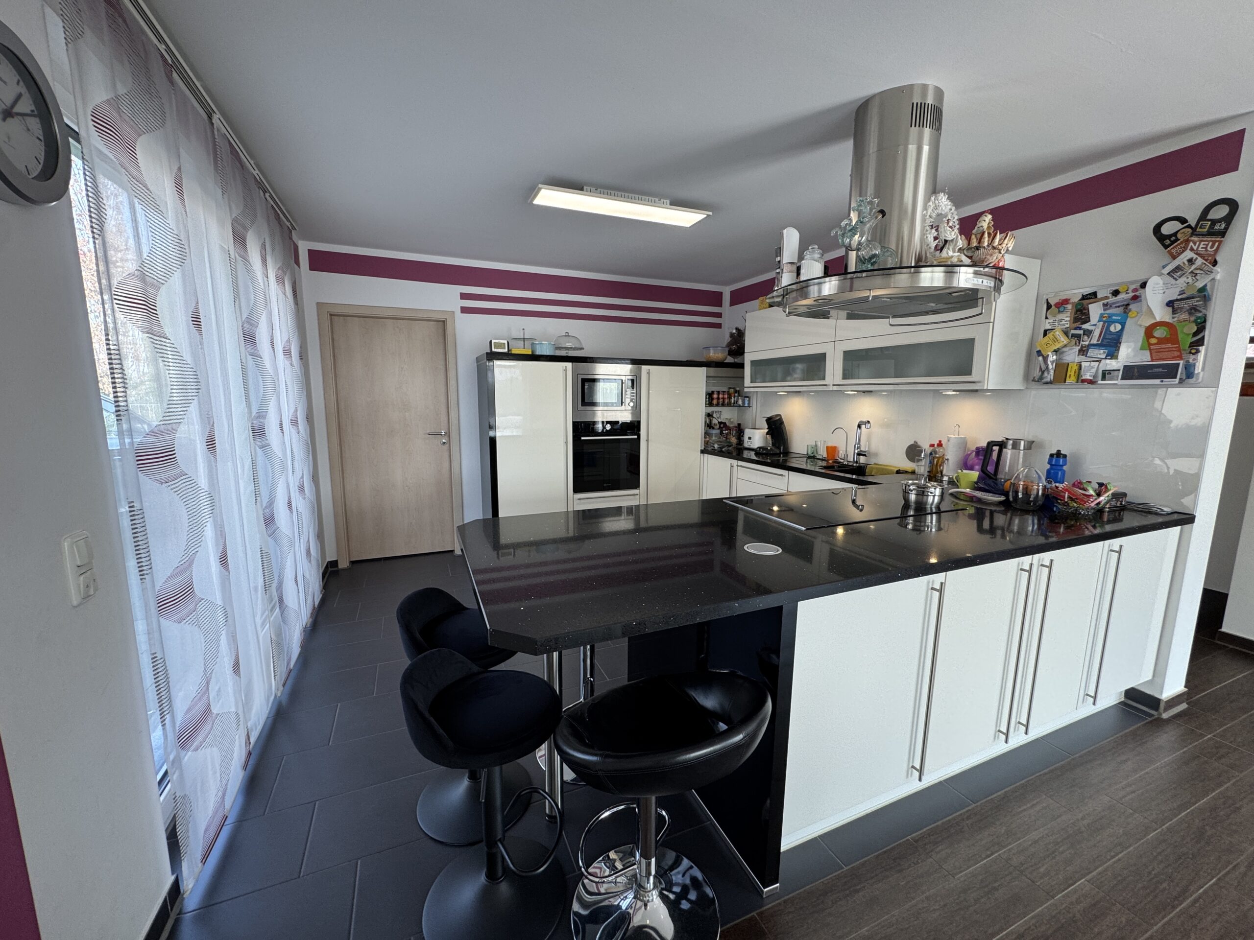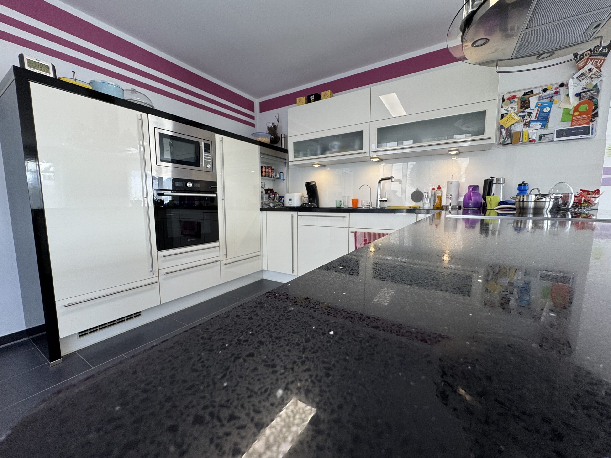 Die Küche ist mit allen notwendigen Geräten ausgestattet und bietet viel Stauraum.