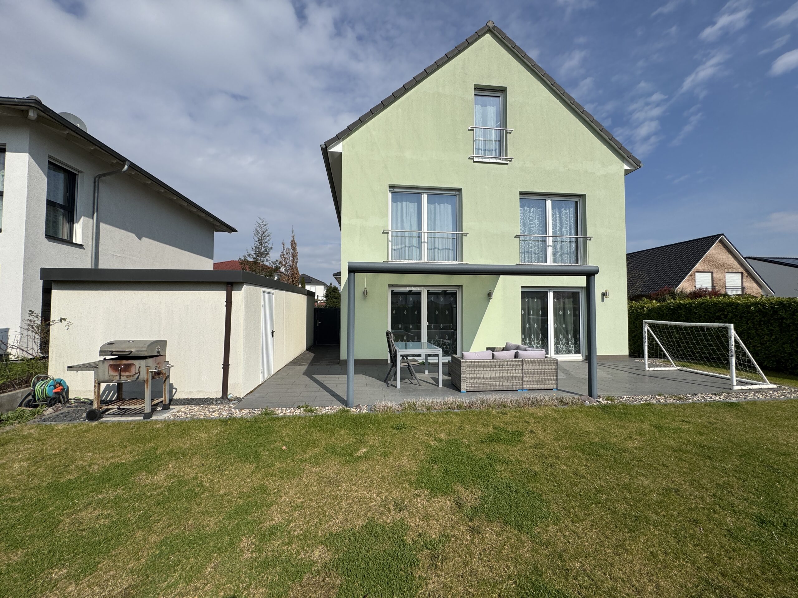 Der Außenbereich besticht durch einen gepflegten Garten, eine Terrasse und eine praktische Gartenbewässerungsanlage.