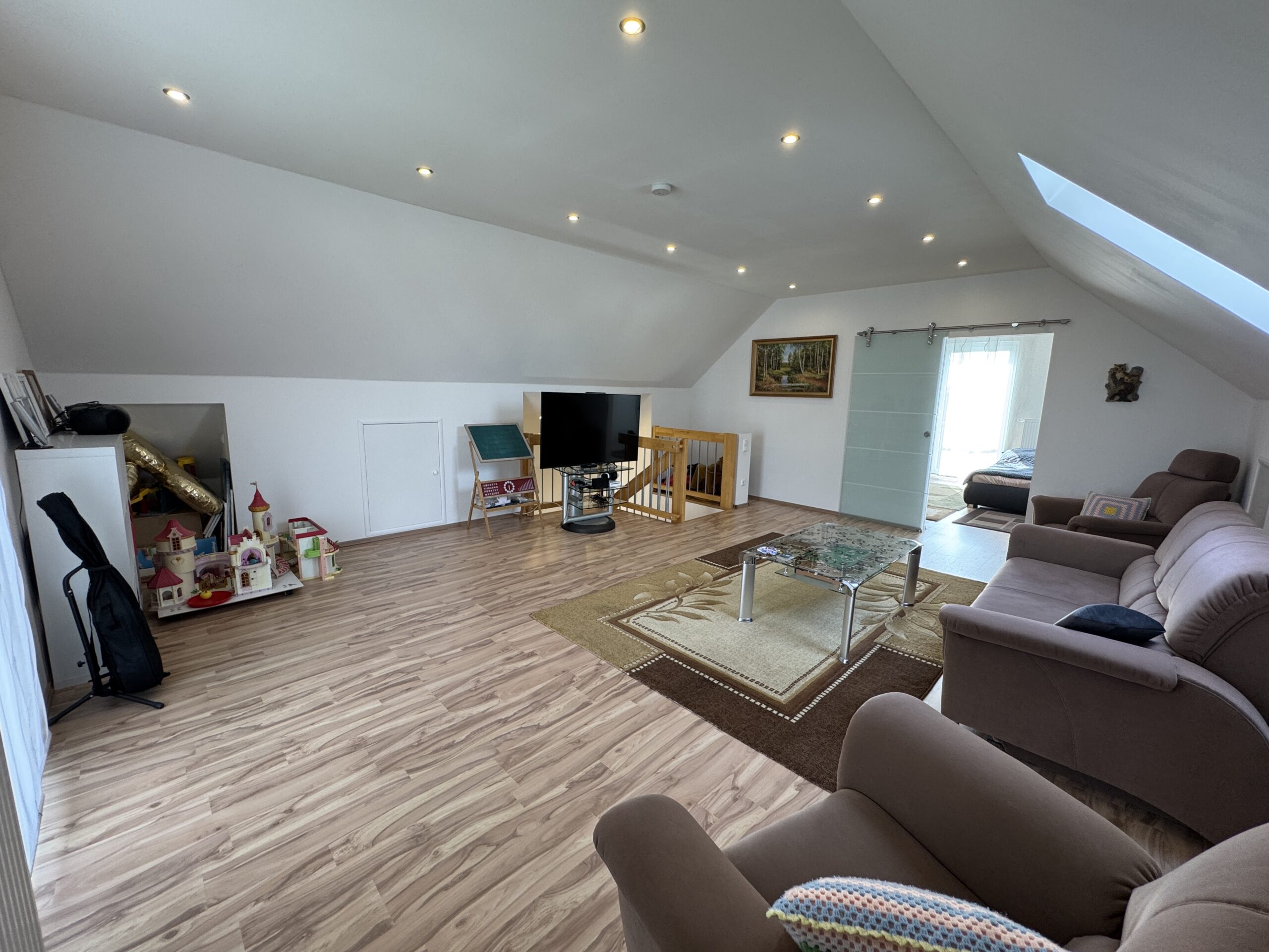 Im Inneren empfängt Sie eine großzügige Raumaufteilung, die sich über drei Etagen erstreckt und eine harmonische Atmosphäre versprüht. Helle, lichtdurchflutete Räume und hochwertige Ausstattungsmerkmale sorgen für ein einzigartiges Wohnerlebnis. Das Haus besteht aus sechs Zimmern, darunter zwei Wohnzimmer, vier Schlafzimmer, ein Badezimmer und ein Gäste-WC.