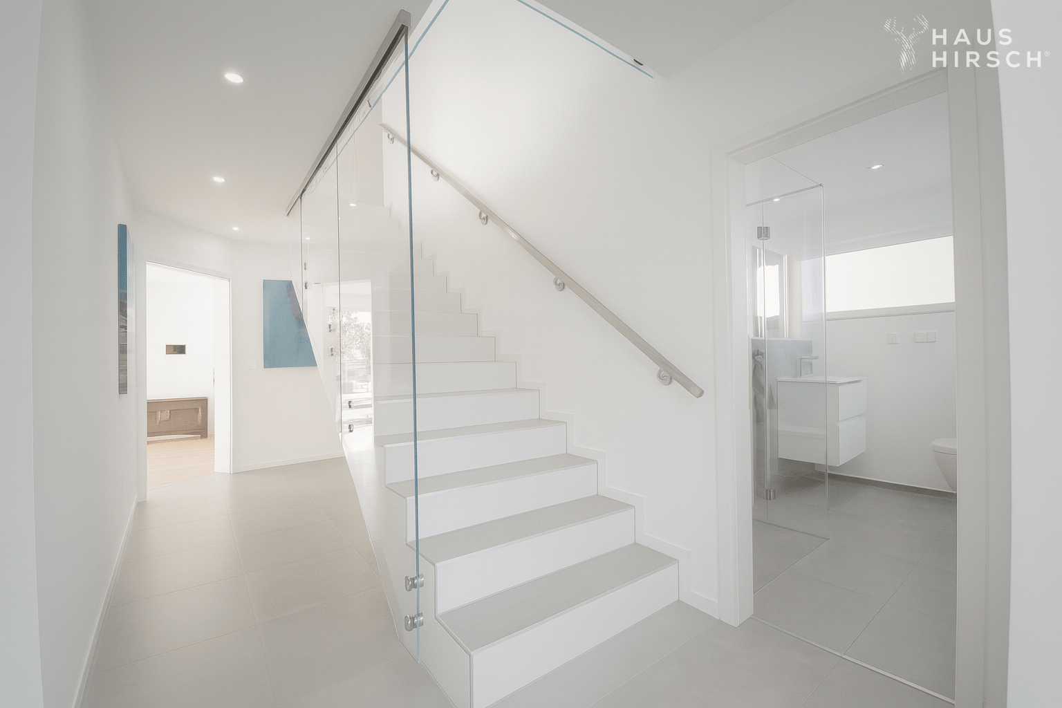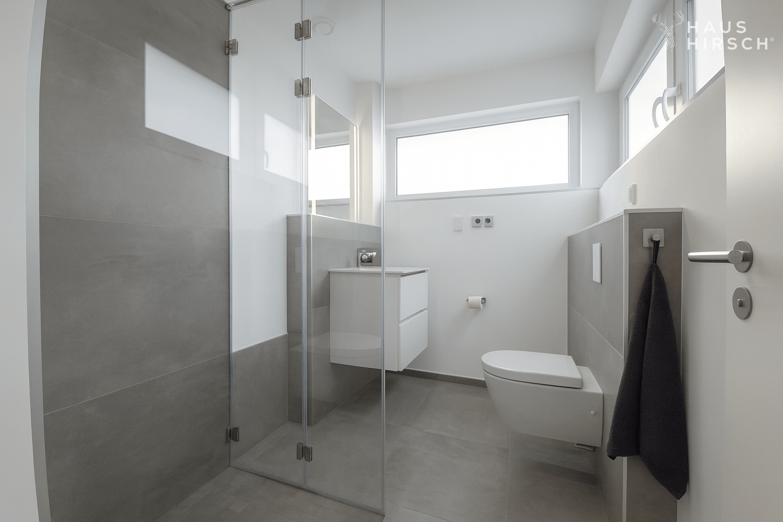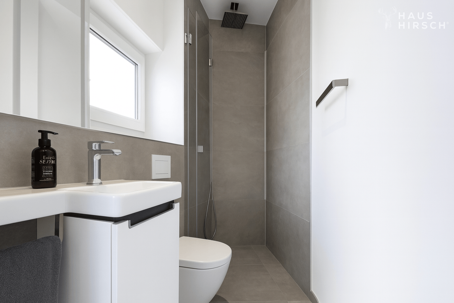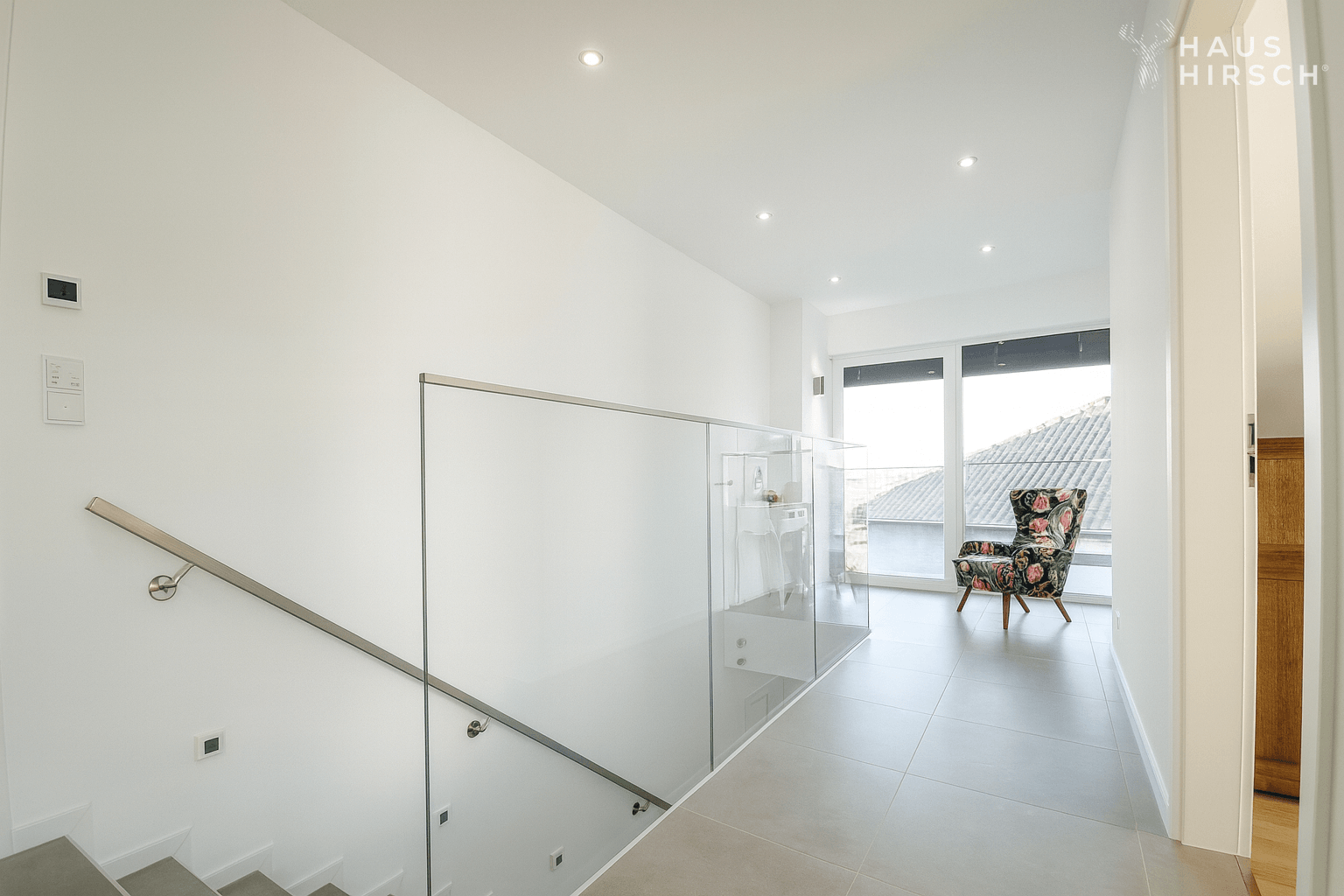 Im Obergeschoss erwarten Sie drei helle Schlafzimmer. Besonders hervorzuheben ist der Elternbereich mit Ankleide, Wellnessbad en Suite sowie Zugang zur eigenen Dachterrasse – ein Ort der Ruhe, an dem Sie den Sonnenuntergang genießen können. Das Bad selbst ist ein echtes Highlight: eine bodengleiche Regendusche mit Wasserfallfunktion, eine XXL-Badewanne und stilvolle Designer-Armaturen verwandeln den Alltag in ein kleines Spa-Erlebnis.