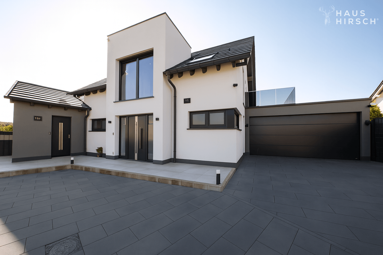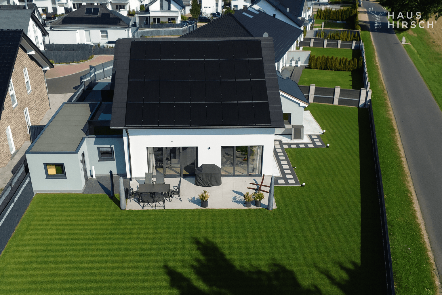 Auch der Außenbereich wurde mit viel Liebe und Weitblick gestaltet: eine großzügige und pflegeleichte 350 m² Rasenfläche mit automatischer Bewässerung, mehrere Terrassen für jede Tageszeit sowie ein „American Porch“ vor dem Haus, der zum Verweilen einlädt. Zudem sind Vorbereitungen für die Nachrüstung einer Sauna oder eines Pools bereits getroffen. Die rund 150 m² große Einfahrt ist durch ein massives Tor vom öffentlichen Verkehrsraum getrennt. Dadurch sind Privatsphäre und Sicherheit gewährleistet – gleichzeitig finden bis zu sechs Autos bequem Platz auf dem eigenen Grundstück, ohne auf öffentliche Parkflächen angewiesen zu sein.