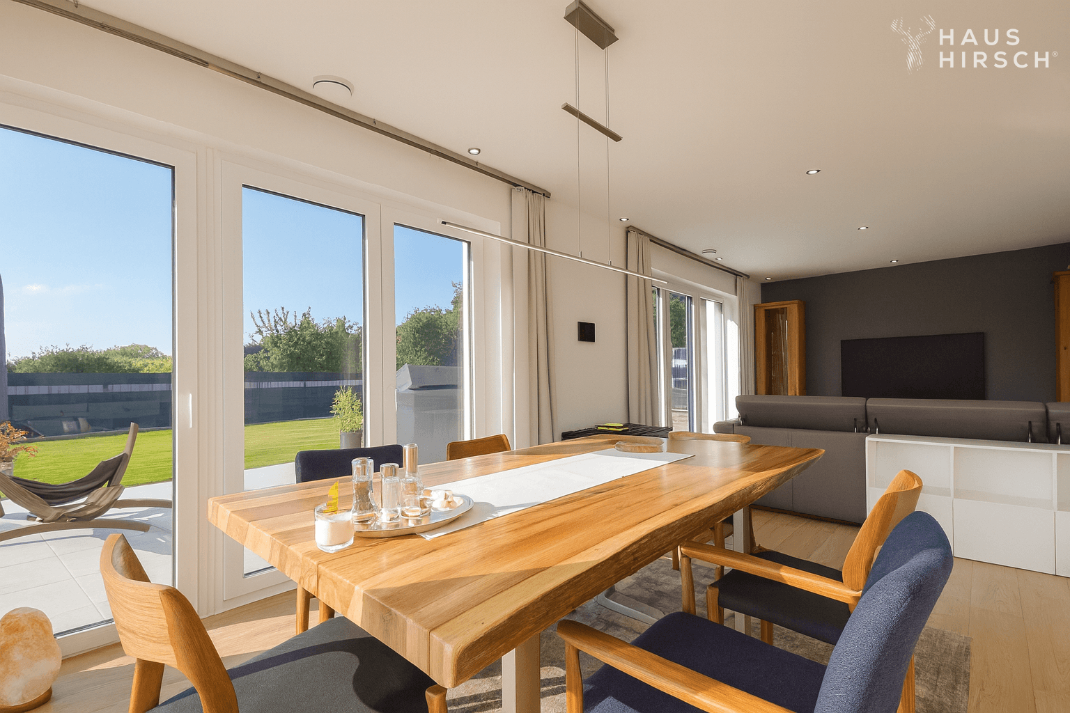 Bereits beim Betreten des Hauses spüren Sie die Großzügigkeit: Eine helle Diele mit elegantem Glasgeländer und stilvoller Treppenbeleuchtung empfängt Sie. Der Wohn- und Essbereich mit bodentiefen Fenstern öffnet sich nach Südwesten und bietet einen traumhaften Blick in den weitläufigen Garten. Hier ist Platz für lange Familientafeln, gemütliche Abende auf dem Sofa oder spielende Kinder im Freien – immer begleitet von Sonne und Natur.