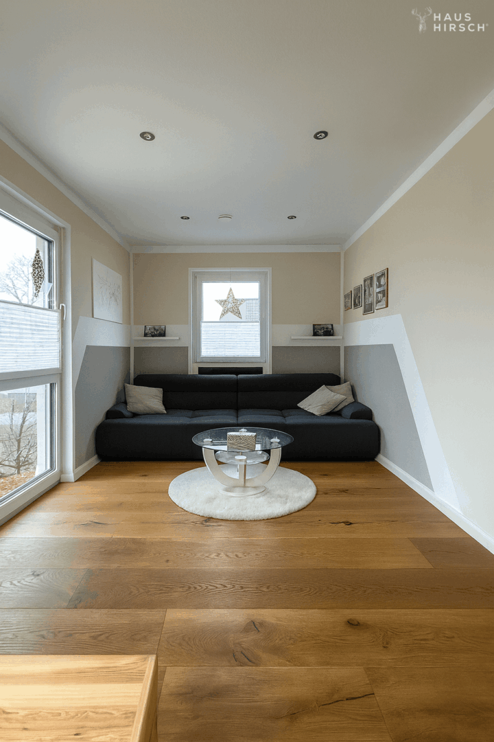Das Wohnhaus erstreckt sich über zwei Etagen und ist vollständig unterkellert. Die Bauweise kombiniert die Vorteile eines Holzständerwerks im Erd- und Dachgeschoss mit einem massiv errichteten Untergeschoss der Firma Glatthaar – ausgeführt in der sogenannten “Weißen Wanne”, die für eine hervorragende Abdichtung gegen Feuchtigkeit sorgt und damit Langlebigkeit und Sicherheit garantiert. Das klassische Satteldach mit Gauben sorgt nicht nur für ein harmonisches Erscheinungsbild, sondern schafft zusätzlichen Raum im Dachgeschoss und eine optimale Raumnutzung.