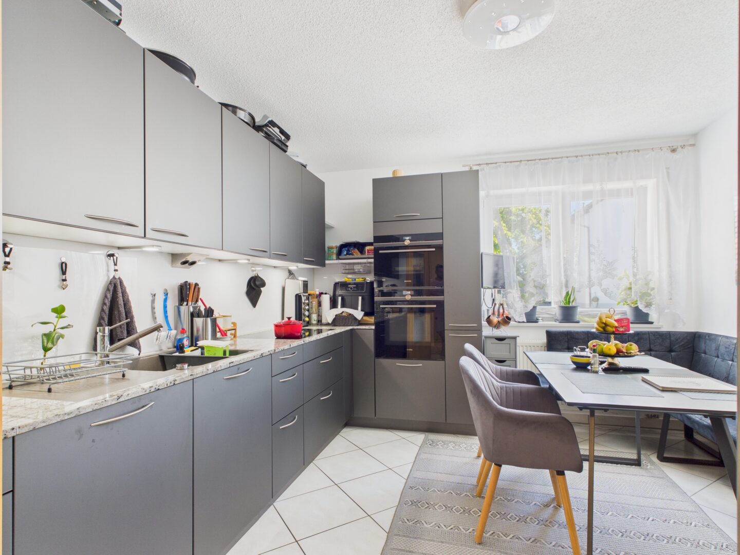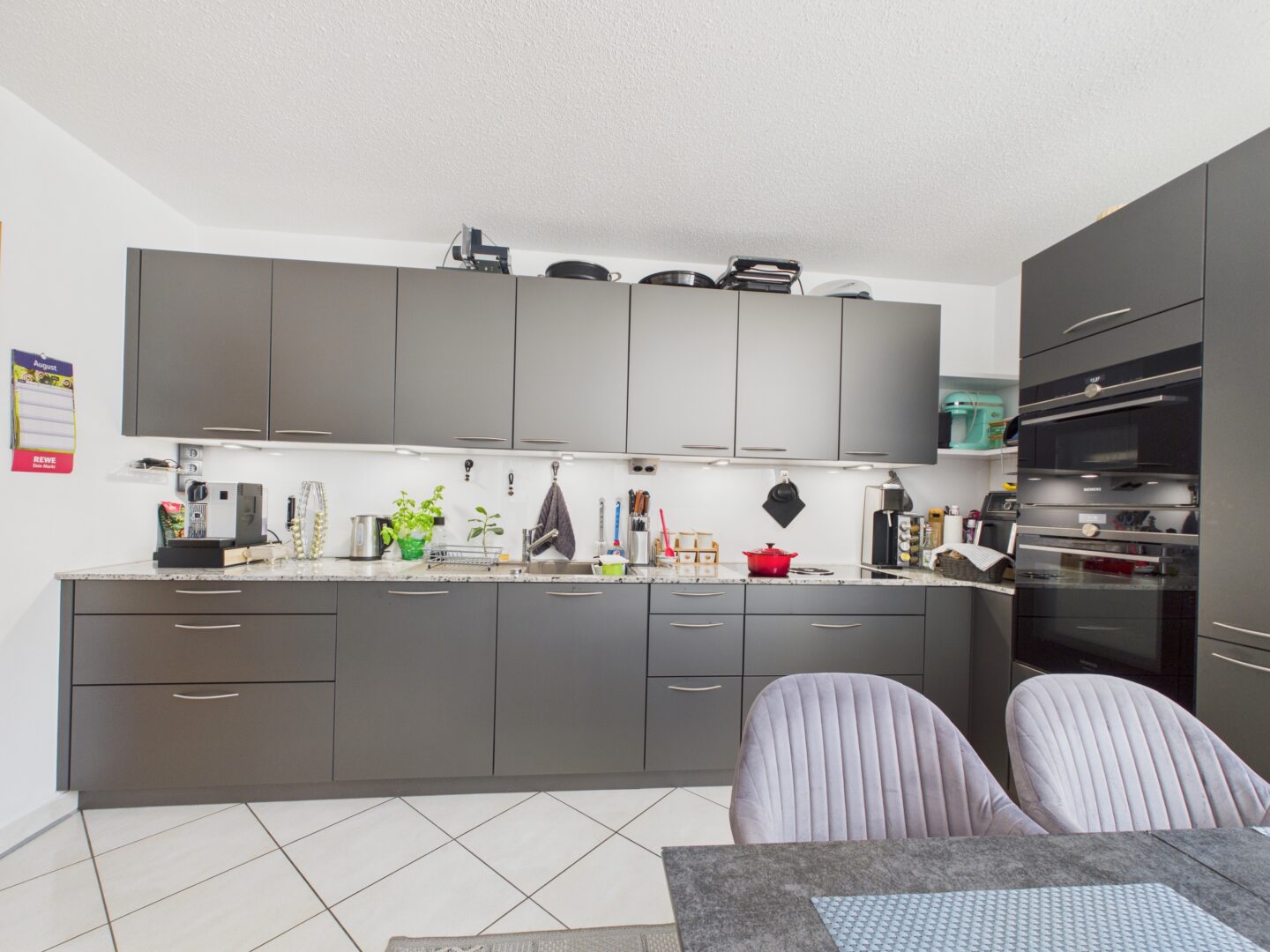 Asmo-Designküche in Dunkelanthrazit mit Bora-Induktion, Siemens Geräten & Granitplatte
