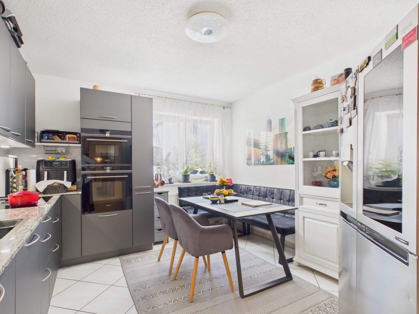 -Neuwertige Asmo Einbauküche mit Bora Induktionkochfeld, Siemens Einbaugeräten und LG Side by Side Kühlschrank
