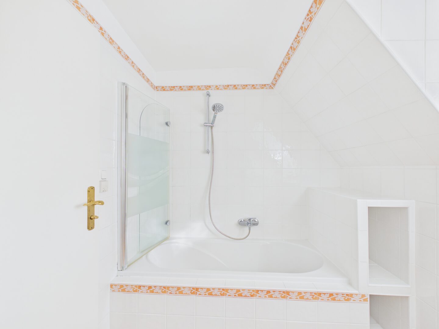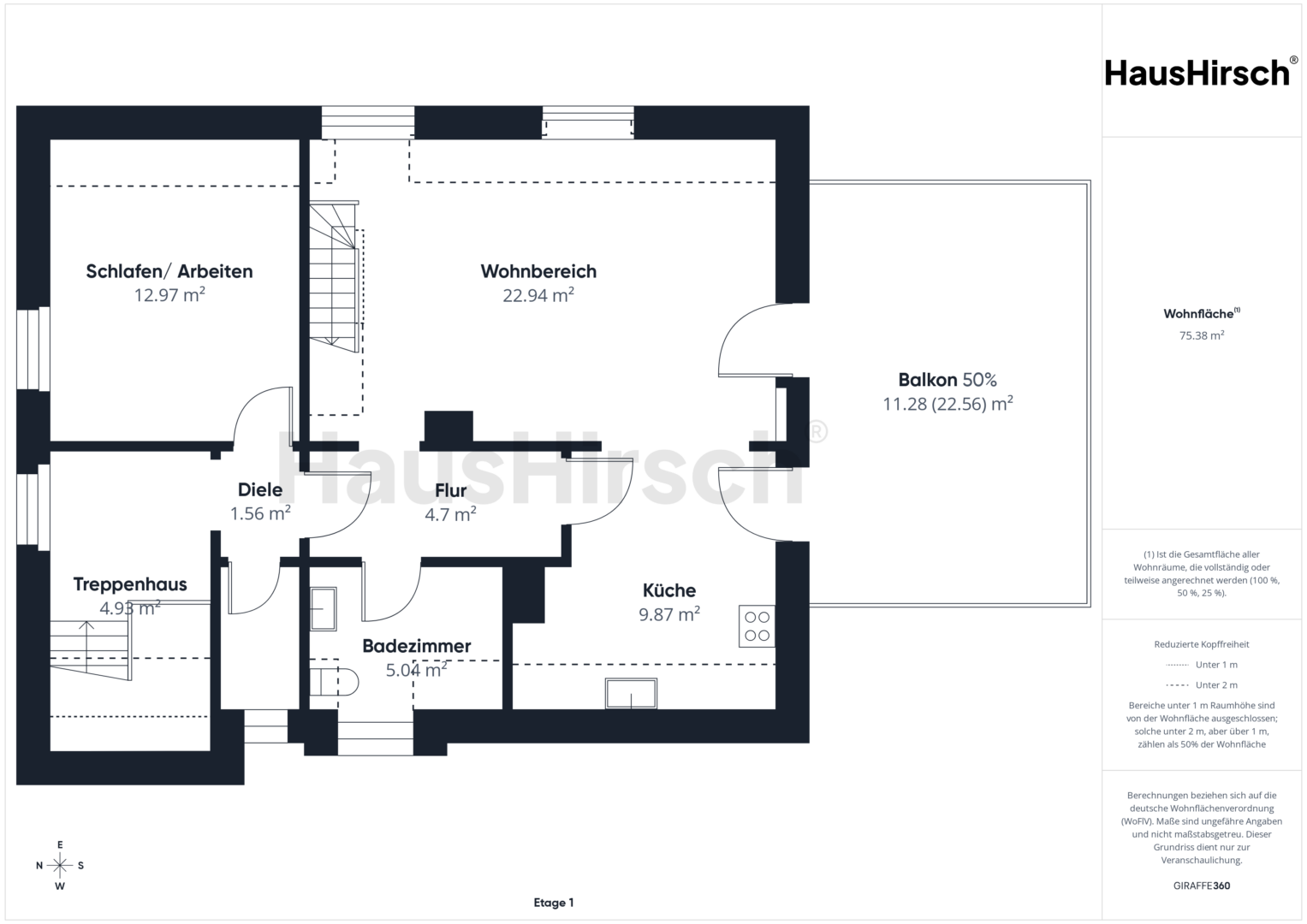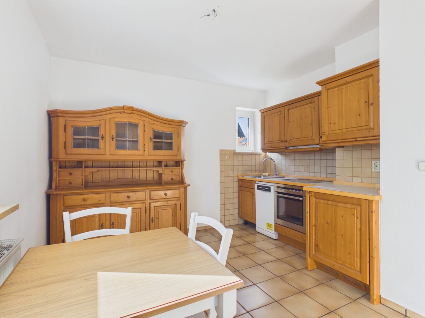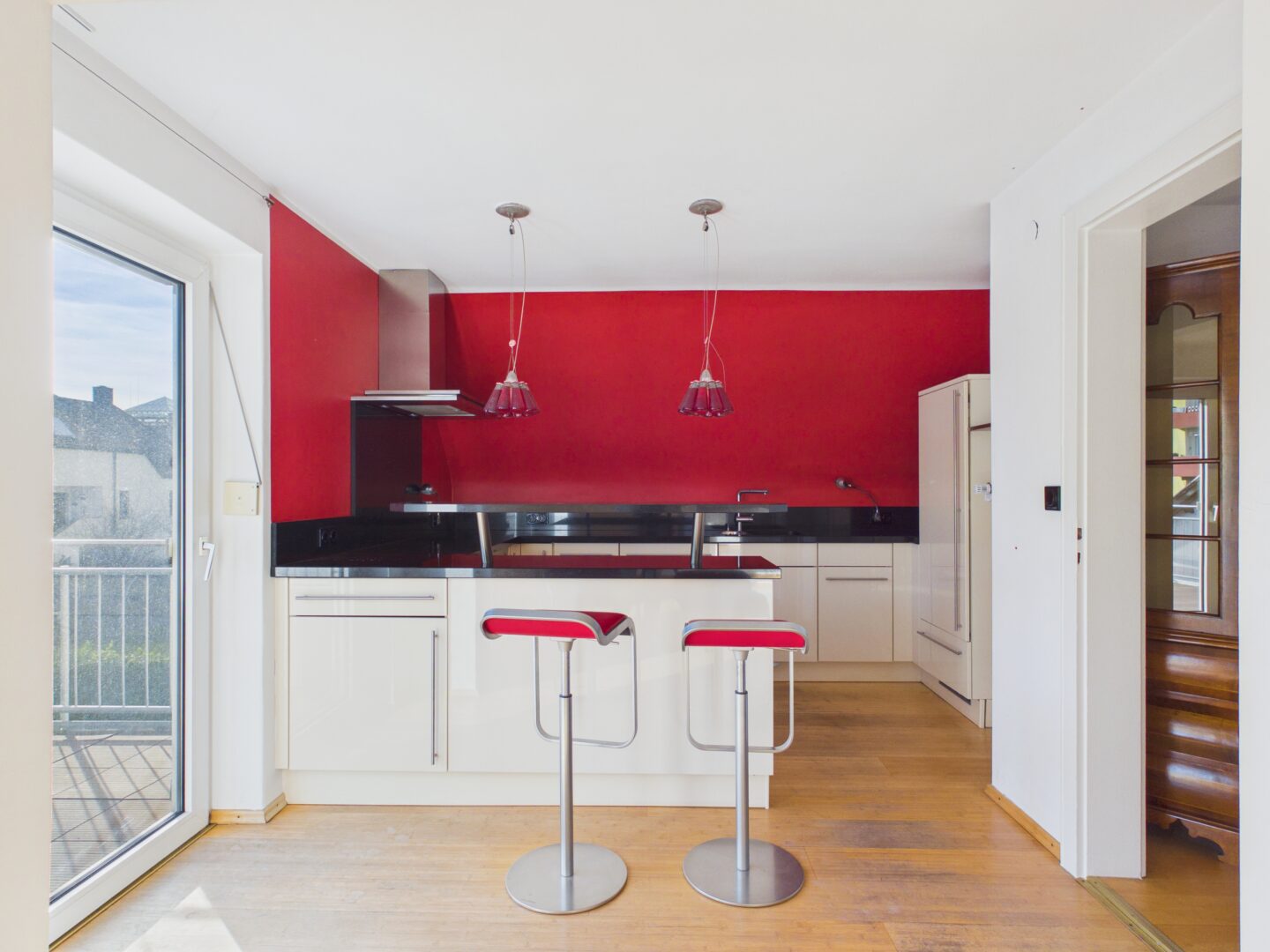 Die Obergeschoss-Einheit bietet ca. 75 m² Wohnfläche auf zwei Ebenen. Im ersten Obergeschoss: ein großzügiger Wohnbereich (22,94 m²), ein Schlaf- und Arbeitszimmer (12,97 m²), eine hochwertige Küche mit Granitarbeitsflächen und sehr gepflegten Markengeräten (9,87 m²), Bad (5,04 m²) und ein weitläufiger Westbalkon (22,56 m² Nutzfläche). Hier kann man sofort einziehen – kein Kompromiss, kein Zwischenschritt. Das Dachgeschoss schließt die Einheit als Maisonette ab: Schlafbereich (19,25 m²) mit begehbarer Ankleide (10,6 m²) – ein Rückzugsort auf drei Ebenen.