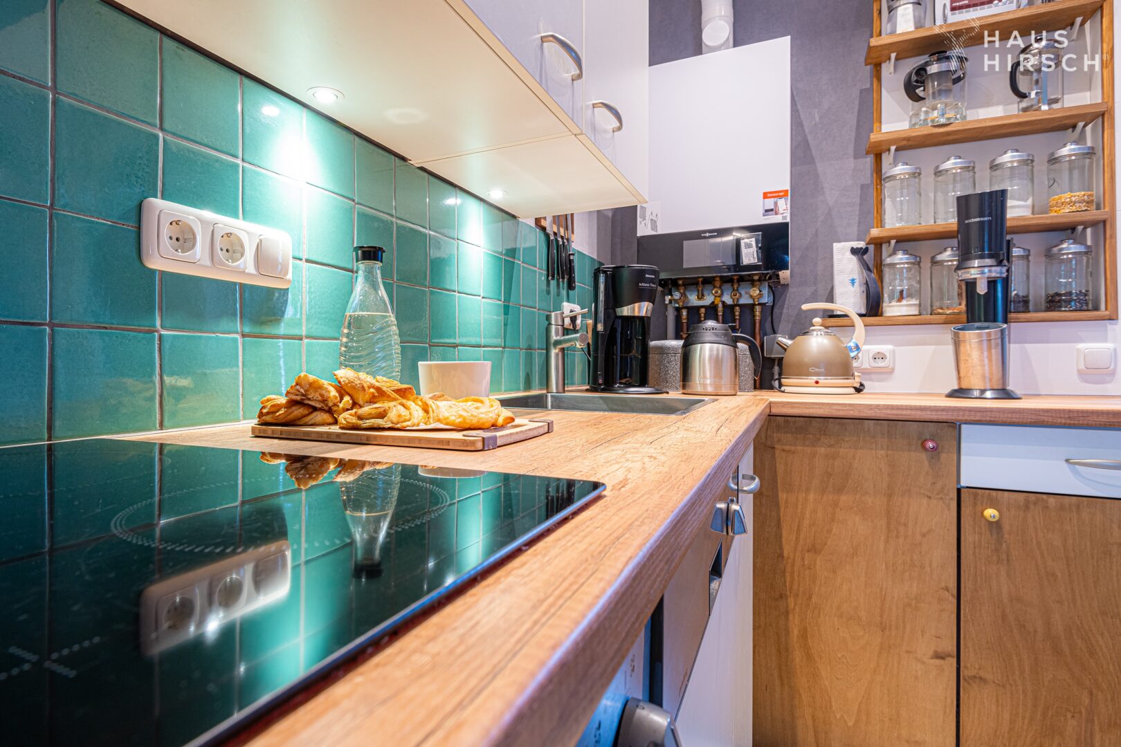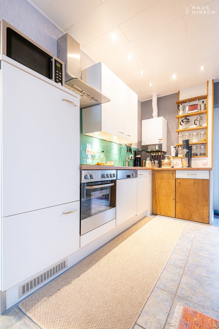 Die Küche ist mit einer vollfunktionsfähigen Einbauküche ausgestattet. Neben Herd, Ofen und Kühlschrank befindet sich noch eine kleine Waschmaschine in der Zeile. Außerdem ist die neue Gastherme aus 2023 in der Küche untergebracht.