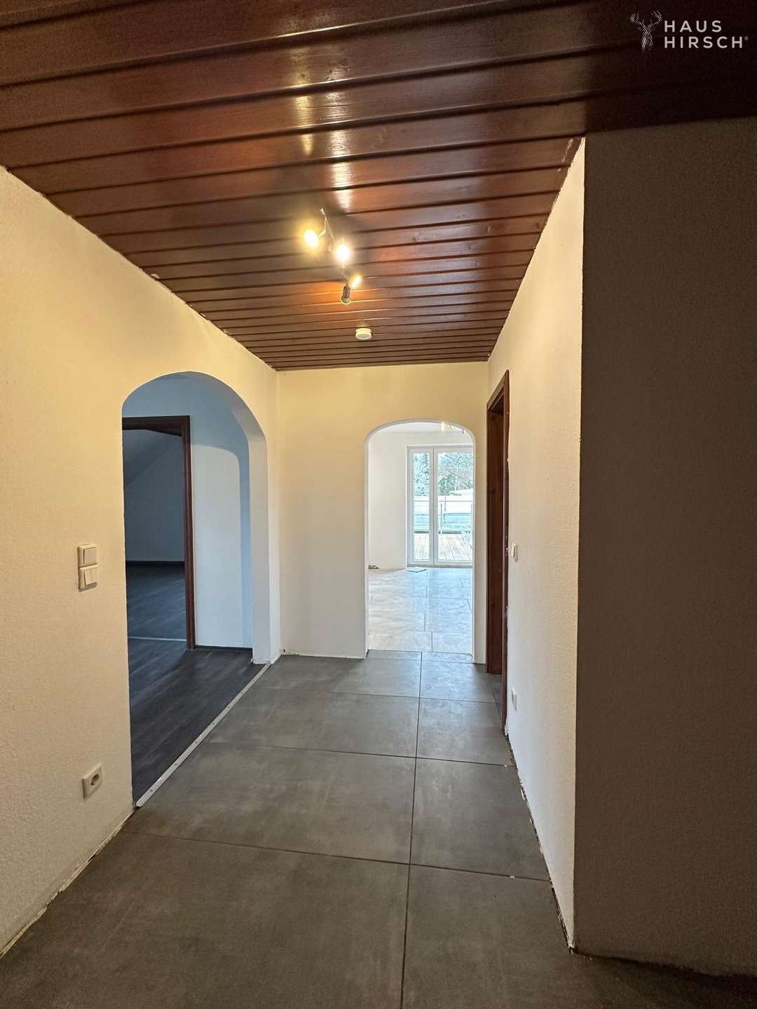 Auch die Wohnung im Obergeschoss ist großzügig gestaltet und verfügt über einen hellen Wohnbereich, eine Wohnküche mit Essbereich, zwei Schlafzimmer, ein Badezimmer mit Dusche und Badewanne sowie Zugang zum Spitzboden. Ein besonderes Highlight ist die große Terrasse mit Blick in den Garten.