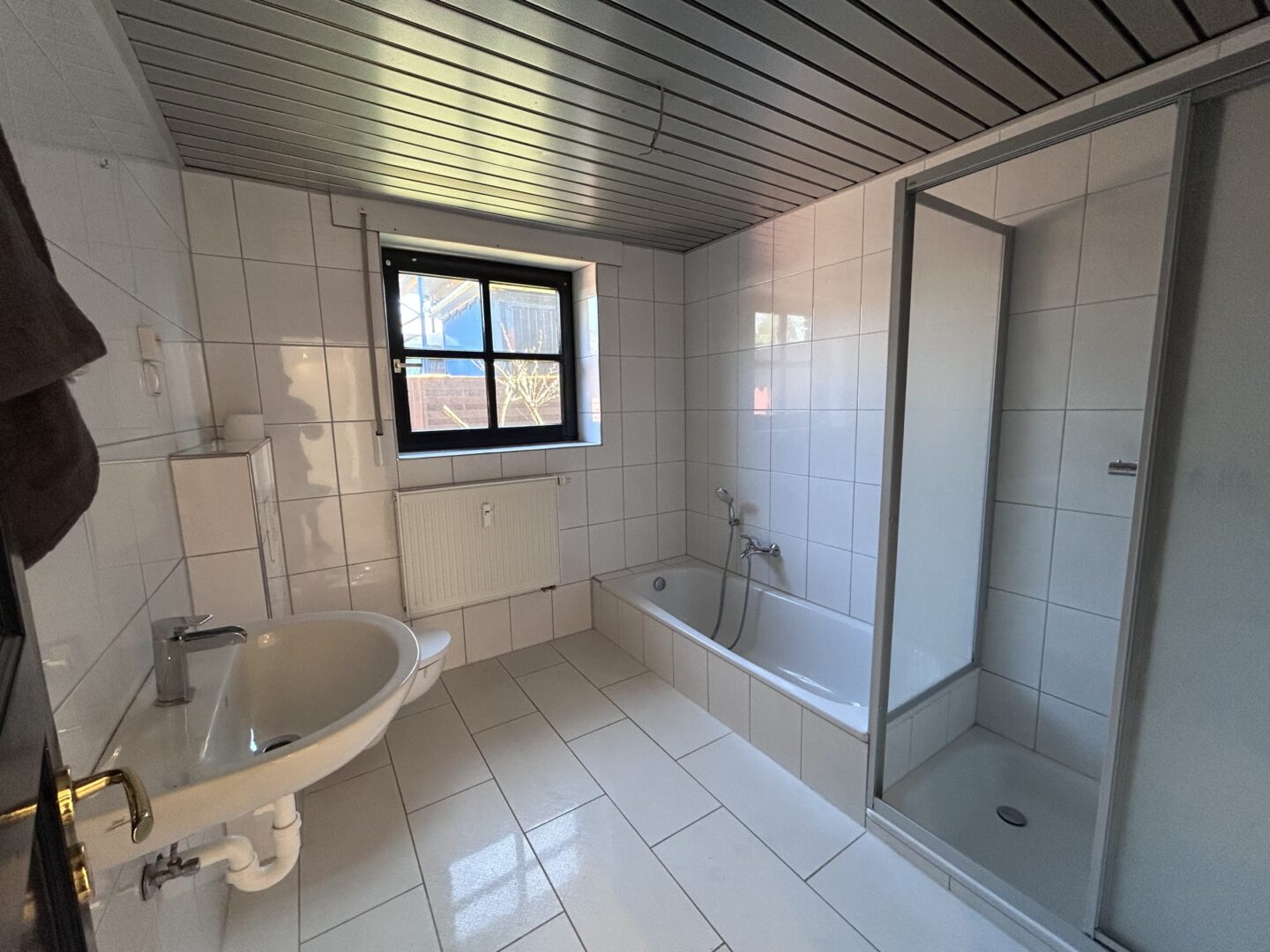 Auch die Wohnung im Obergeschoss ist großzügig gestaltet und verfügt über einen hellen Wohnbereich, eine Wohnküche mit Essbereich, zwei Schlafzimmer, ein Badezimmer mit Dusche und Badewanne sowie Zugang zum Spitzboden. Ein besonderes Highlight ist die große Terrasse mit Blick in den Garten.