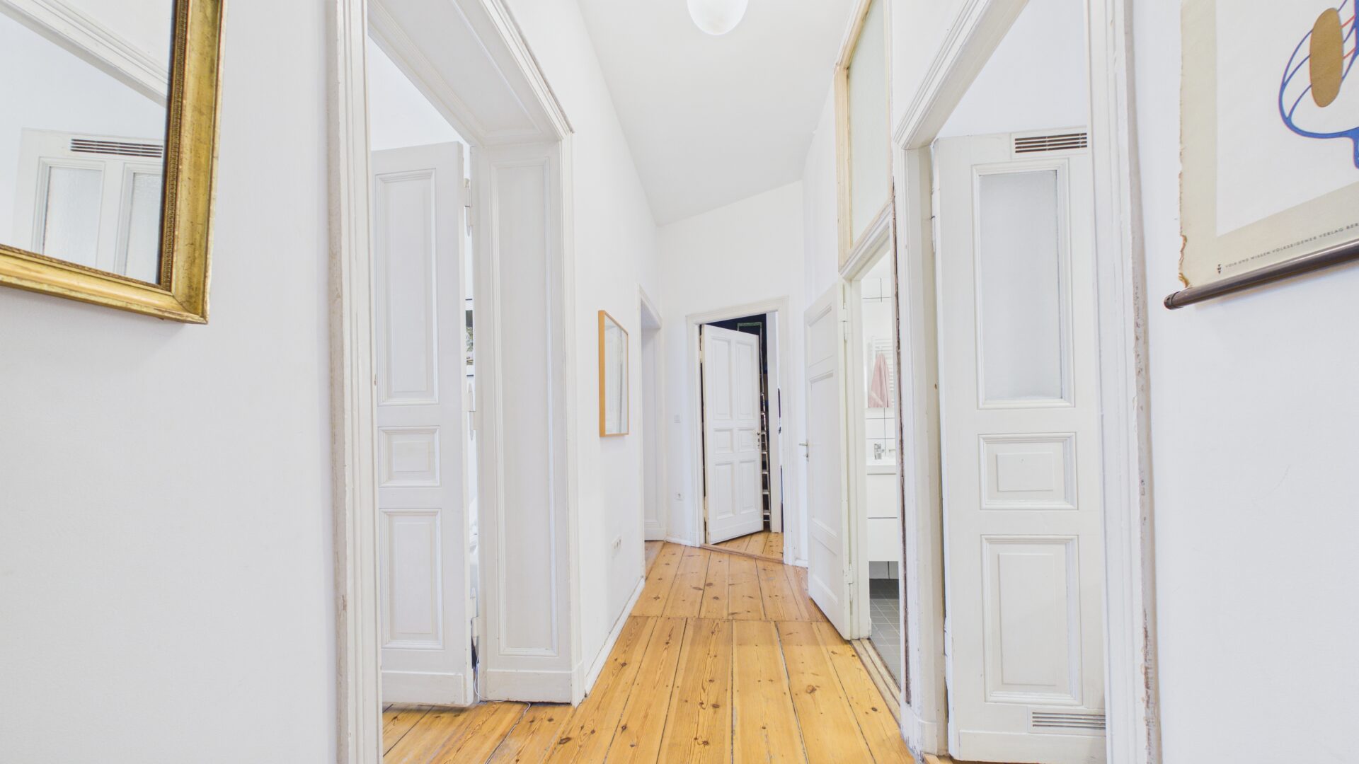Die erste Wohnung umfasst ca. 100 m², ist derzeit leerstehend und sofort bezugsfertig. Sie überzeugt durch den klassischen Altbaucharme, hohe Decken, originale Dielenböden und große Fensterflächen, die für ein helles, freundliches Wohnambiente sorgen. Das Wohnzimmer bildet den zentralen Treffpunkt, während zwei Schlafzimmer flexible Nutzungsmöglichkeiten bieten. Ein Balkon erweitert den Wohnraum ins Freie und sorgt für entspannte Momente.