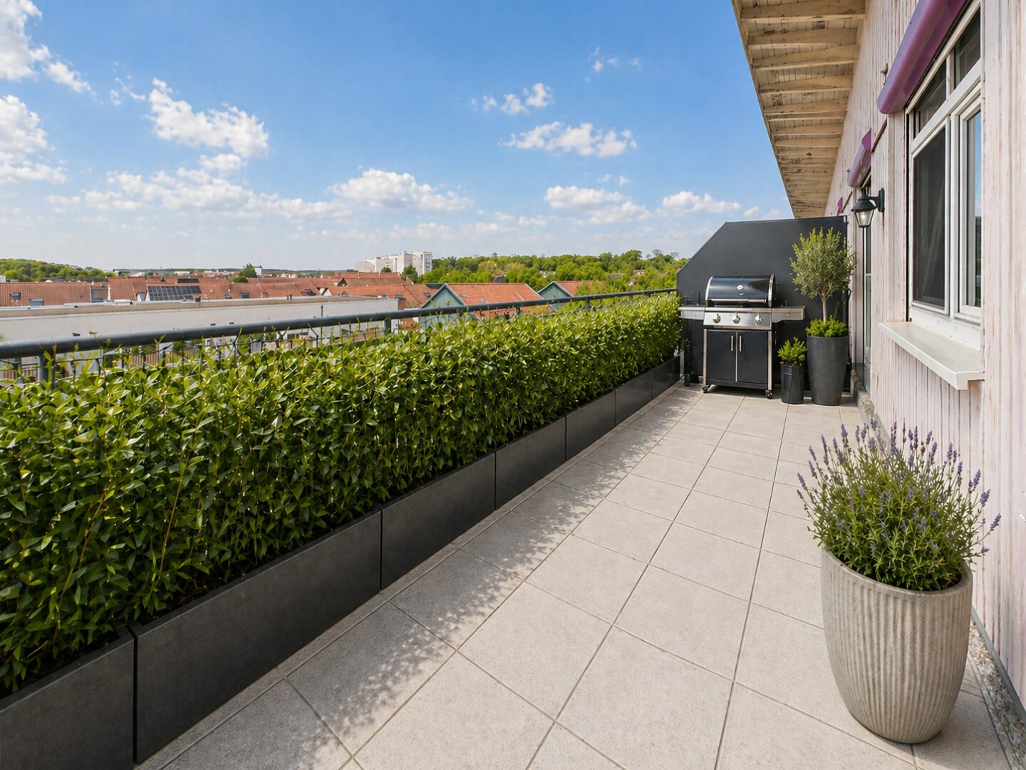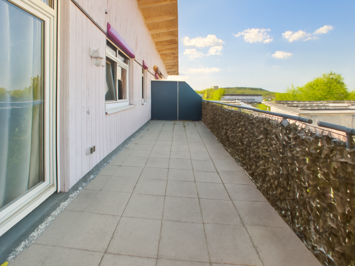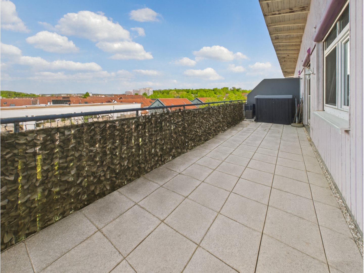 Ein absolutes Highlight ist der großzügige Balkon mit einer Fläche von ca. 21,5 m², der durch seine stabile Bauweise vielseitige Nutzungsmöglichkeiten bietet – selbst das Aufstellen eines Pools ist hier realisierbar. Durch die Lage im obersten Geschoss genießen Sie hier viel Sonne, einen freien Ausblick sowie ein hohes Maß an Privatsphäre.